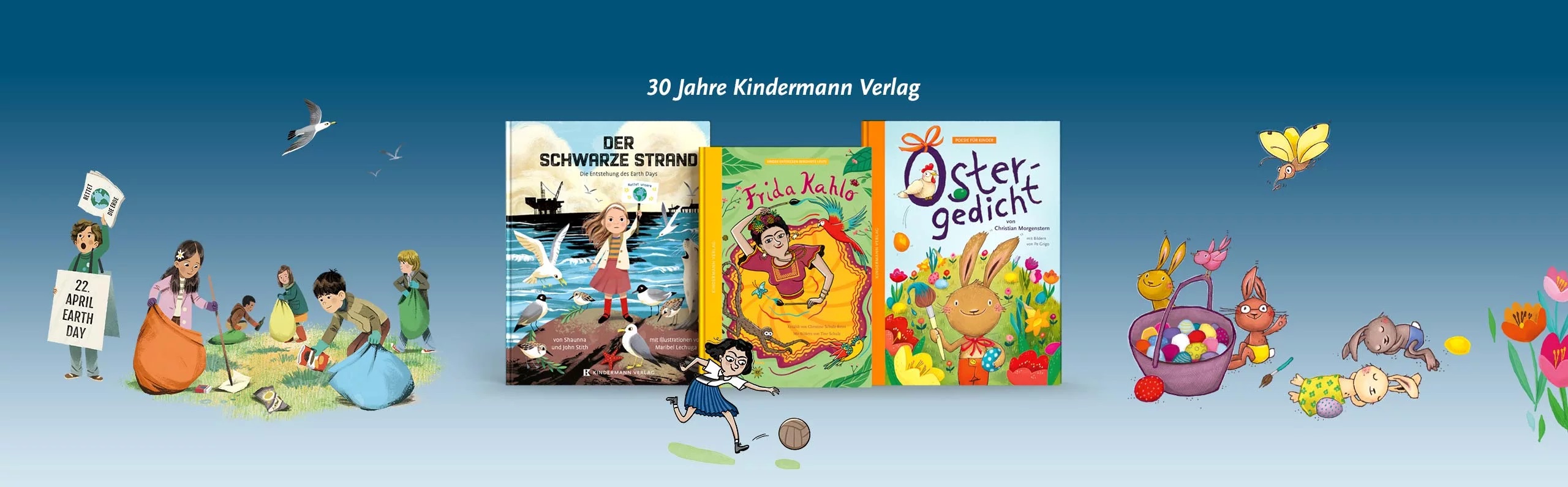 Das Jubiläumsjahr soll ein buntes Bilderbuch-Jahr werden, das zum Schmunzeln, Staunen, Lernen, Träumen und natürlich zum Feiern einlädt. Es wird Ausstellungen mit Originalillustrationen, unter anderem im Struwwelpeter-Museum in Frankfurt oder eine Verlagsausstellung in Berlin, geben. Darüber hinaus Werkstattgespräche, wie zum Beispiel mit Anna Kindermann in „Auerbachs Keller“ in Leipzig. Im Sommer findet in Berlin ein Sommerfest statt und im Dezember wird eine Ausstellung mit Bildern von Sabine Wilharm im Kinderbuchhaus Hamburg das Jubiläumsjahr ausklingen lassen. 30 Jahre Kindermann Verlag mit drei Buchcovern: Der schwarze Strand, Frida Kahlo und Ostergedicht