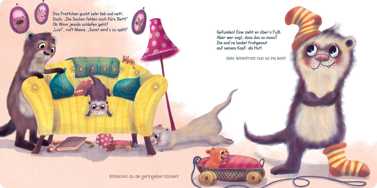 Nur noch schnell eine Geschichte lesen und mit Papa kuscheln – und dann ab ins Bett! Doch vorher muss Winni noch die Zähne putzen und Pipi machen. Und wo sind eigentlich seine geringelten Schlaf-Socken? Die fehlen auch noch. Eigentlich sollte das kleine Frettchen längst schlafen, aber ihm fallen immer wieder neue Dinge ein, die erledigt werden müssen. Und müde? Nein, das ist Winnifrett ganz bestimmt noch nicht! Da haben Mama und Papa ganz schön zu tun…