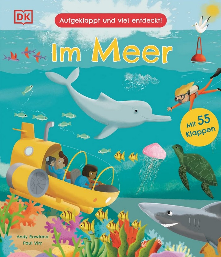 In „Aufgeklappt und viel entdeckt: Im Meer“* von Paul Virr steht die fantastische Meereswelt und die Lebewesen, die sie zu Hause nennen, im Mittelpunkt. Interaktiv lädt das Klappenpappbilderbuch dazu ein, das Leben im und um das Meer zu entdecken. Dabei werden die verschiedenen Lebensräume wie der Strand, die Korallenriffe oder die Polarmeere auf je einer Doppelseite näher beleuchtet.