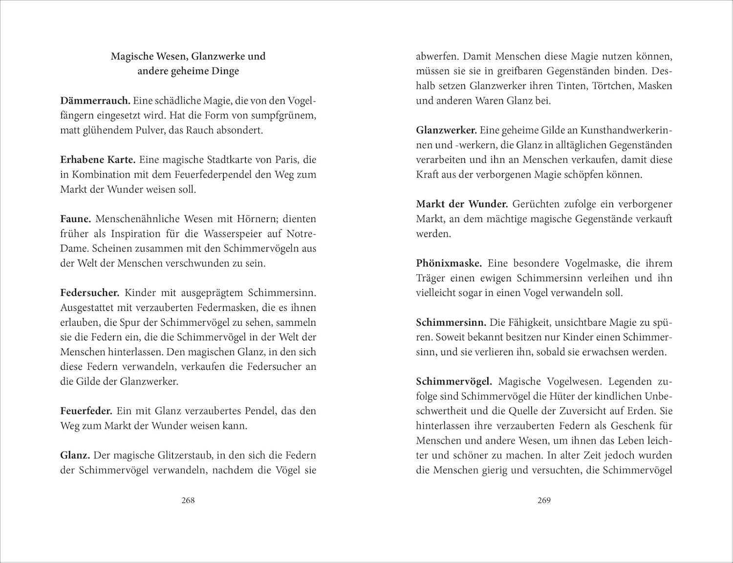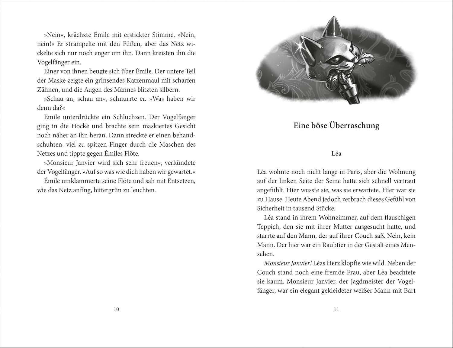 Nachdem Léa zusammen mit Alex, Roux, Ari und Coralie nun das magische Feuerpendel gefunden und ihren ganz besonderen Schimmersinn entdeckt hat, wartet bei ihr zu Hause schon die nächste Überraschung. Ihre Mutter hat ihre Kollegen aus dem Museum zum Abendessen eingeladen. Und das sind ausgerechnet Monsieur Reynard Janvier und Dr. Êve Bernon, die beide für die Lumière-Stiftung arbeiten. Oder besser gesagt für die Vogelfänger. Das Essen hat einen Grund, denn Léas Mutter ist für die Stiftung schon seit Jahren tätig und weiß um die Magie der Schimmervögel. Nun soll Léa auf die Schule der Lumière-Stiftung gehen und auch deren Geheimnisse kennenlernen.