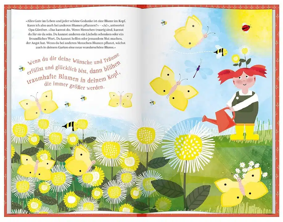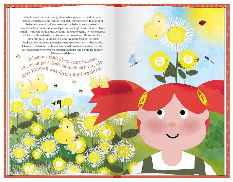 Ein Sturm hat sich in ihrem Kopf zusammengebraut, die Sonne ist verschwunden. Aber Opa Günther hat da eine Idee: Gemeinsam pflanzen sie Blumen in Johannes Kopf. Er erklärt ihr, dass jedes positive Erlebnis und jeder freudige Gedanke wie eine Blume in einem inneren Garten ist. Und je mehr dieser guten Gedanken und Momente wie zum Beispiel ein Lächeln, Erinnerungen oder Dankbarkeit hinzukommen, desto mehr Blumen blühen. Und das Schönste daran: Das ist nicht nur bei sich selbst möglich, sondern auch bei anderen…