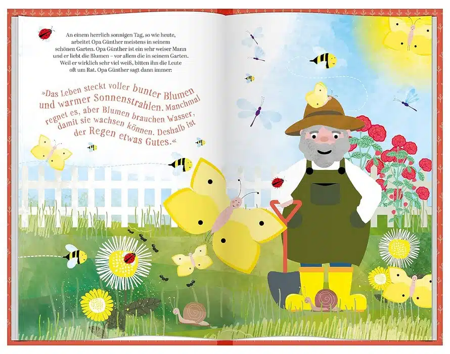 Es ist ein herrlich sonniger Tag. Opa Günther arbeitet in seinem Garten und wartet auf seine Enkelin. Dabei genießt er das Flattern der Schmetterlinge, das Summen der Bienen und die Blütenvielfalt um sich herum. Immer wieder denkt er daran, wie glücklich er sich schätzen kann. Doch da kommt seine Enkelin Johanna weinend in den Garten, und Opa Günther sieht die dunkle Regenwolke, die ihre Gedanken verhüllt.