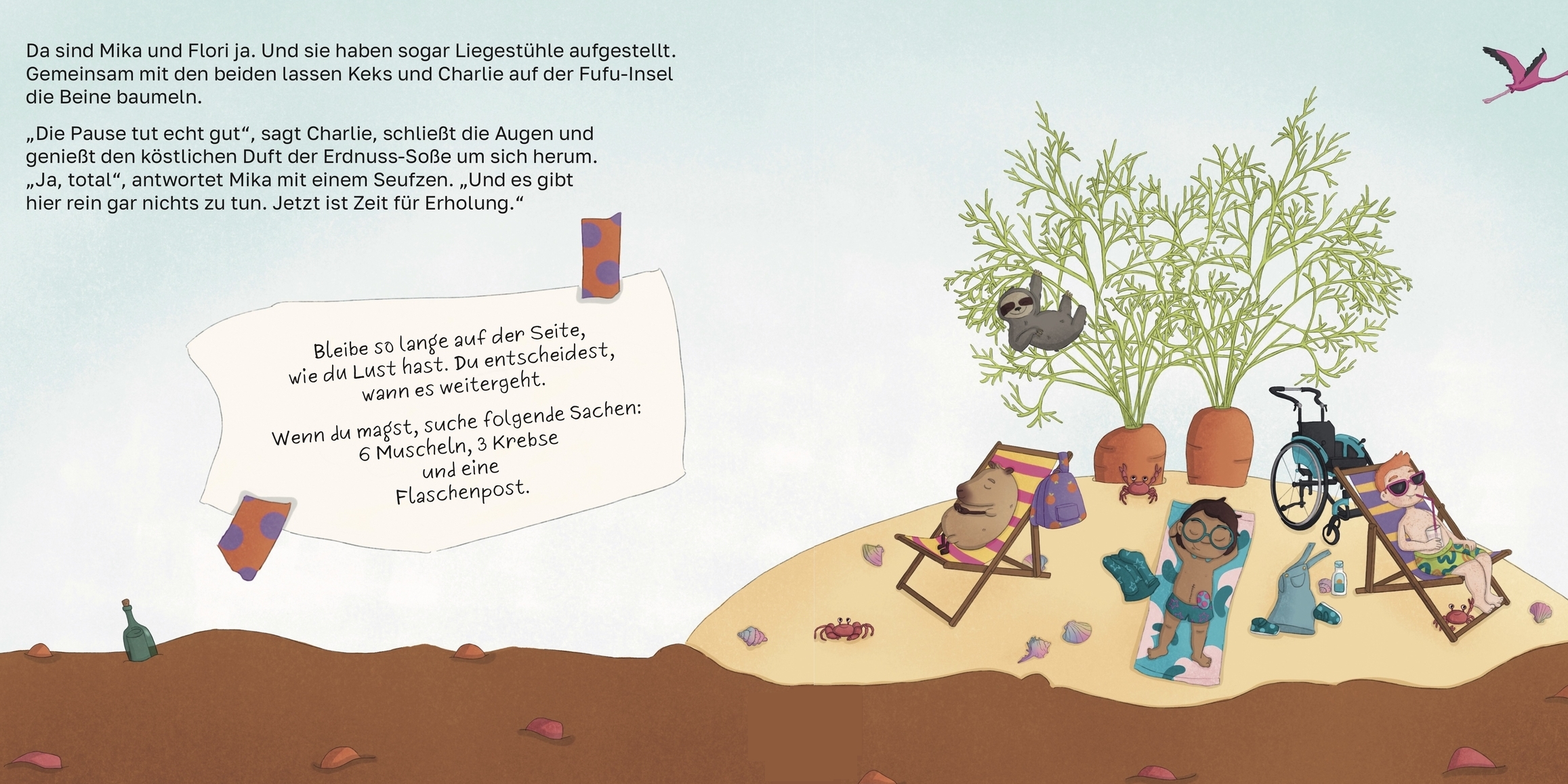 Durch die Brokkoli-Bäume folgen sie einer Nudel, die über einen blubbernden Tomatensaucen-Fluss führt. Hier treffen sie Lou und Orly Otter. Auf dem Pfannkuchen-Berg warten schon Yuki und Spinne Sam. Bo und Waschbär Walty finden sie bei den Sushi-Hüpfsteinen. Flamingo Fee fliegt sie dann auf die Fufu-Insel zu Mika und Flori. Nach dem unterirdischen Ausflug zu Raya und Maulwurf Merli sind sie alle zusammen zurück im Brokkoli-Wald. Und Keks strahlt übers ganze Gesicht, denn dort wartet eine riesengroße Überraschung auf alle…