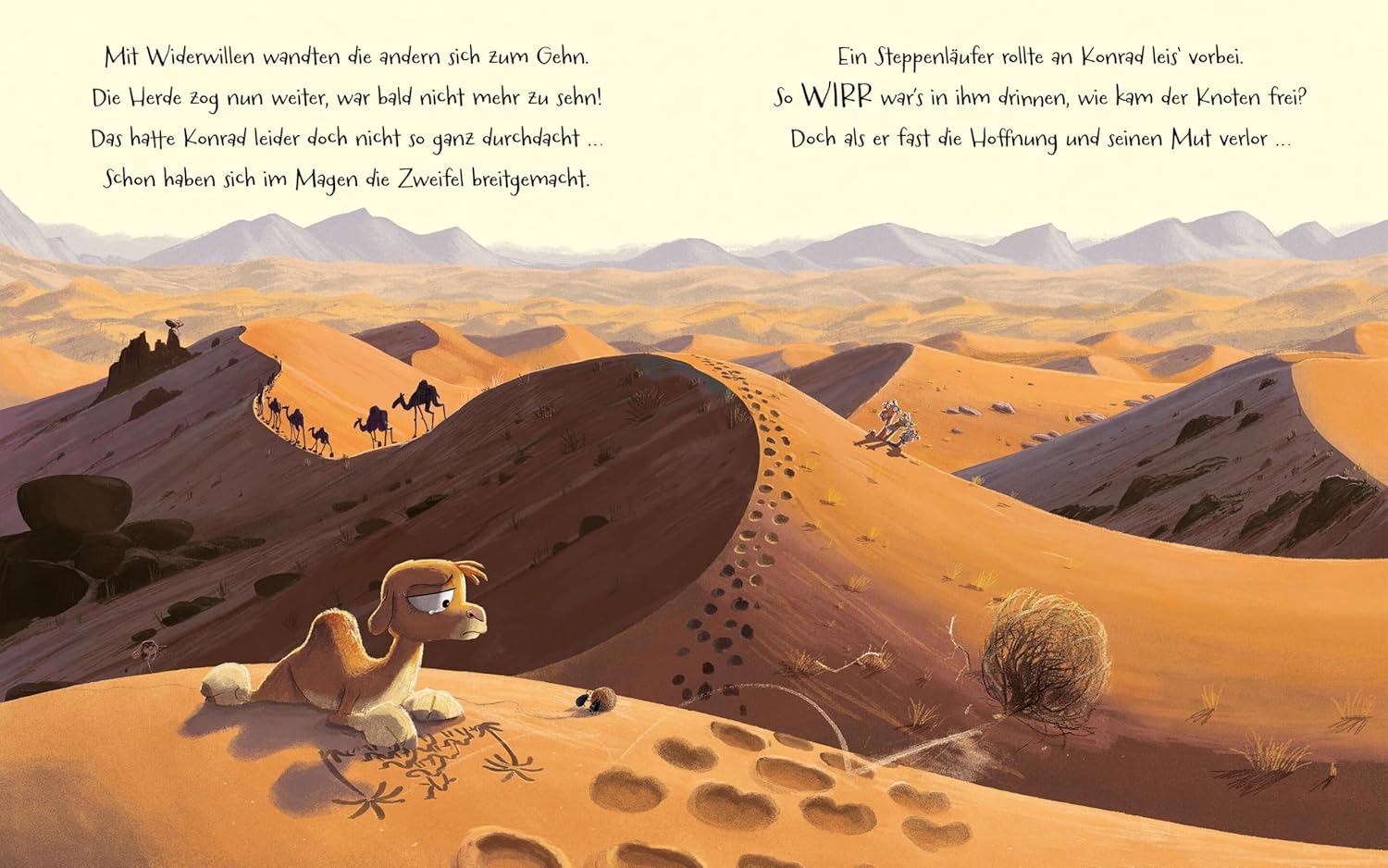 Der große Tag ist da: Konrads Kamelherde macht sich auf den Weg zur Oase – alle freuen sich riesig. Alle, außer Konrad. Er hat einfach keine Lust. Er ist müde, genervt und von Kopf bis Fuß in schlechte Laune gehüllt. Widerwillig trottet er mit, doch jeder Schritt ist einer zu viel, jeder Sonnenstrahl viel zu heiß und irgendwann hat er genug davon. Er bleibt einfach sitzen und mag nicht mehr weiter gehen. Egal was die anderen auch versuchen – ziehen, schieben, zureden – Konrad rührt sich nicht. Er bleibt zurück, während seine Herde weiterzieht.
