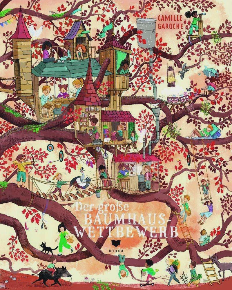 In „Der große Baumhauswettbewerb“* von Camille Garoche geht es auf eine Reise von Kontinent zu Kontinent zu beeindruckenden Bäumen – vom Kampferbaum und Schirmkiefer über Sumpfzypresse und Eiche bis hin zur Zeder, Feige und dem Baobab – aus der ganzen Welt. Nicht als eine Erzählung im üblichen Sinn, sondern in einer Kombination aus einführenden Seiten mit kurzen Informationen über den Baum, und sich anschließenden Wimmelbild-Doppelseiten mit sieben imaginären Baumhäusern; von denen eines unglaublicher als das andere ist.
