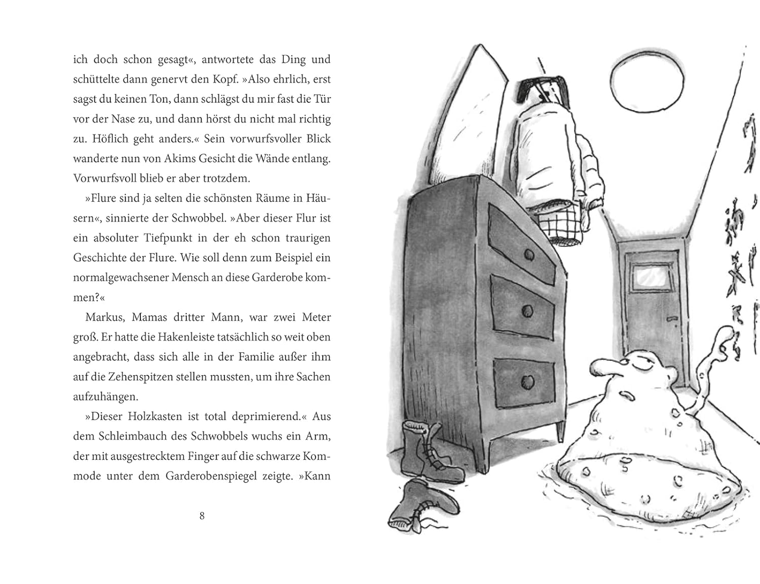 Akim traut seinen Augen nicht, als plötzlich eine große Masse an Schleim vor seiner Tür steht. Da der Schwobbel, so heißt das Wesen, Farbe und Form wechseln kann, funktioniert Akims Versuch, diesen einzuschließen nicht, denn er kommt als plattgedrückte Pfütze unter der Tür wieder durch. Auch an dem Entschluss, bei Akim einzuziehen, ist nicht zu rütteln. Dass Akim sein Zimmer nicht aufgeräumt hat, beeindruckt den Schleim wenig. Ganz im Gegenteil, die herumliegenden alten Socken sind für den Schwobbel eine Delikatesse.