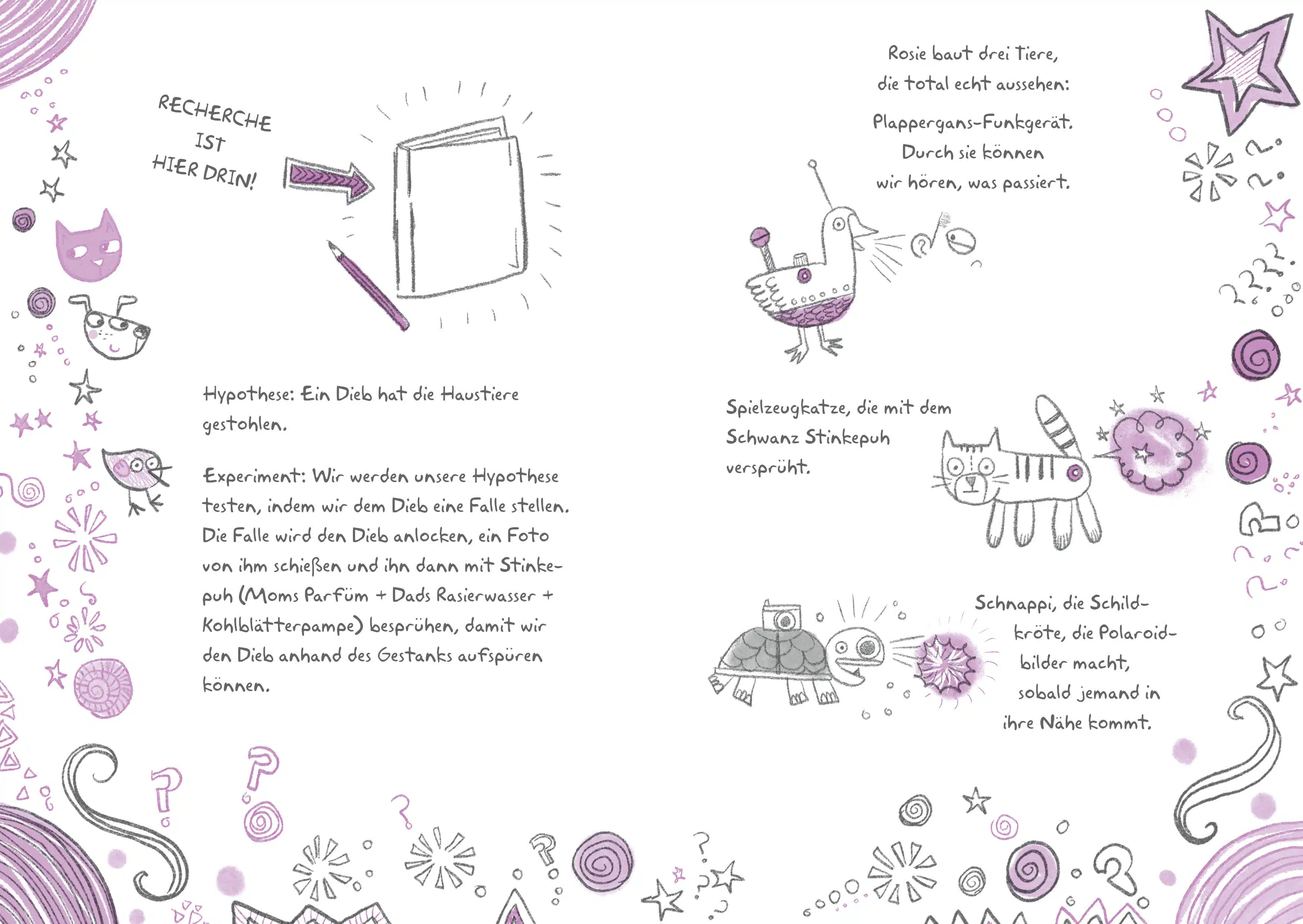 Warum sind so viele Tiere verschwunden? Gibt es in Bad Blaubach einen Tierdieb? Und wie lässt sich herausfinden, was mit ihnen geschehen ist? – Obwohl sie persönlich in den Fall involviert sind, wollen Ada, Sofia, Rosie, Aaron und Iggy logisch vorgehen, das heißt keine voreiligen Schlüsse ziehen sowie der wissenschaftlichen Methode folgen: Beobachten, Fragen stellen, nachforschen, Daten sammeln, experimentieren und Hypothese überprüfen. Werden sie das Rätsel lösen können?