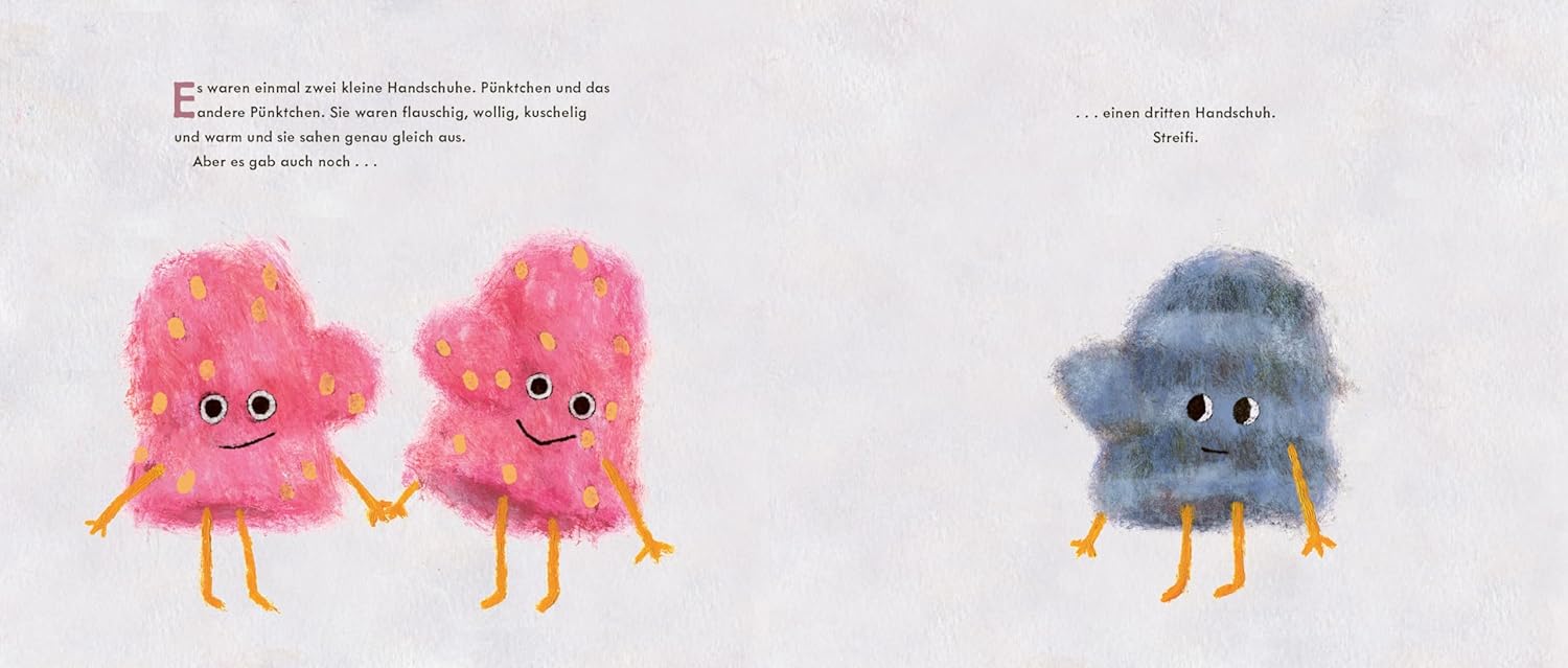Es waren einmal zwei kleine Handschuhe. Pünktchen und das andere Pünktchen. Sie waren flauschig, wollig, kuschelig und warm, und sie sahen genau gleich aus. Aber es gab auch noch einen weiteren Handschuh. Streifi. Sie gehören alle einem Kind. Aber Pünktchen und das andere Pünktchen sind sich sicher, dass ihr Kind Streifi gar nicht tragen wird, denn was nützt schon ein einzelner Handschuh. Da auch Streifi keinen Grund sah, warum das Kind einen einzelnen Handschuh tragen sollte, versteckte sie sich tief in der Jackentasche des Kindes. Bis eines Tages das andere Pünktchen verloren ging. Jetzt gab es nur noch Pünktchen und Streifi. Und das Kind beschloss, sie zusammen zu tragen.