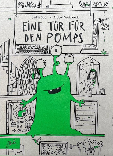 In der Kinderbuchwerkstatt malt Marie auf einem alten Plakat die verblassenden Konturen eines grünen Wobbelwesens mit drei Antennenaugen nach. Plötzlich purzelt dieses lachend mit einem lauten Pomps aus dem Bild. Das gab es bisher noch nie. Sonst kommen die Kinderbuchfiguren nur durch eine der unzähligen Türen der Kinderbuchwerkstatt. Doch das grüne Wesen hat keinen Namen, keine Geschichte und es gibt auch keine Tür, durch die es schlüpfen könnte; so wie bei den anderen Figuren. Es wird wahrscheinlich verblassen, wenn sich das nicht ändert. Doch Marie traut sich nicht.