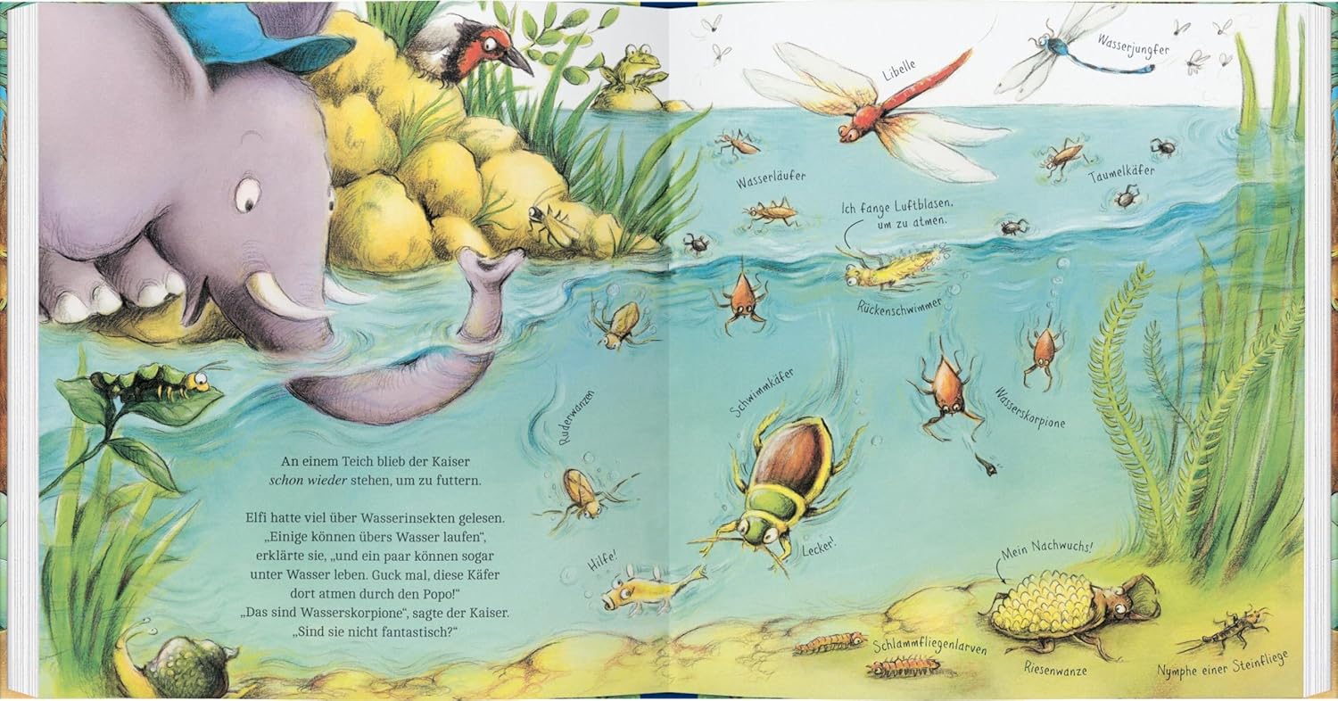 An ein paar Bäumen halten sie an. Während Kaiser an deren Blättern knabbert, zeigt er ihr Nester; die hoch oben in den Ästen hängen, die sich unter den Wurzeln im Boden befinden und auch welche in der Landschaft, die turmhoch aufragen. Am Teich entdecken sie, dass es sogar Insekten gibt, die im Wasser leben. Sie sehen Mistkäfer mit Dungkugeln oder pollensammelnde Bienen. Überall entdecken sie Erstaunliches. Elfi notiert sich viele Dinge und zeichnet Bilder. Bis zum Abend sind sie unterwegs. Dann verabschiedet sich Kaiser von Elfi auf mysteriöse Weise. Ob Elfi ihn wohl wiedersehen wird?