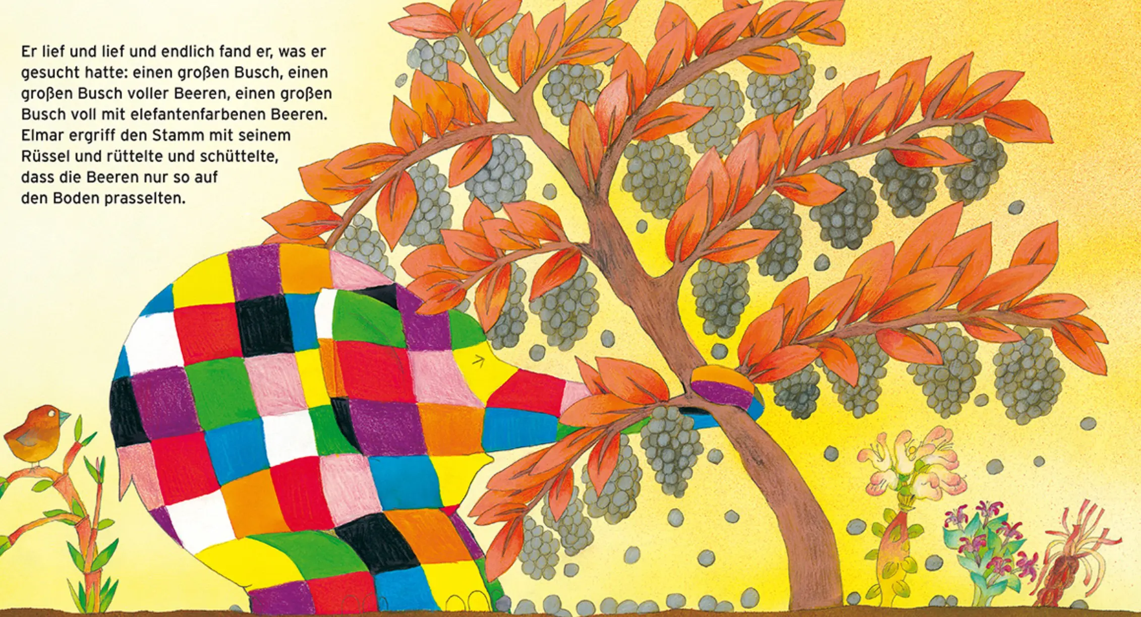 One night Elmer couldn’t sleep for thinking. He was tired of being different. He tought: „Whoever heard of a ptachwork elephant? No wonder they laugh at me!“. Elmer walked through the jungle. After a long walk, Elmer found a large bush. A bush covered with berries – elephant coloured berries. Once the ground was covered in berries, Elmar lay down and rolled over and over. When he had finished, Elmar looked like any other elephant. But on the way back, Elmer wasn’t recognised by the animals. None of them noticed Elmer. After a while he felt that something was wrong…