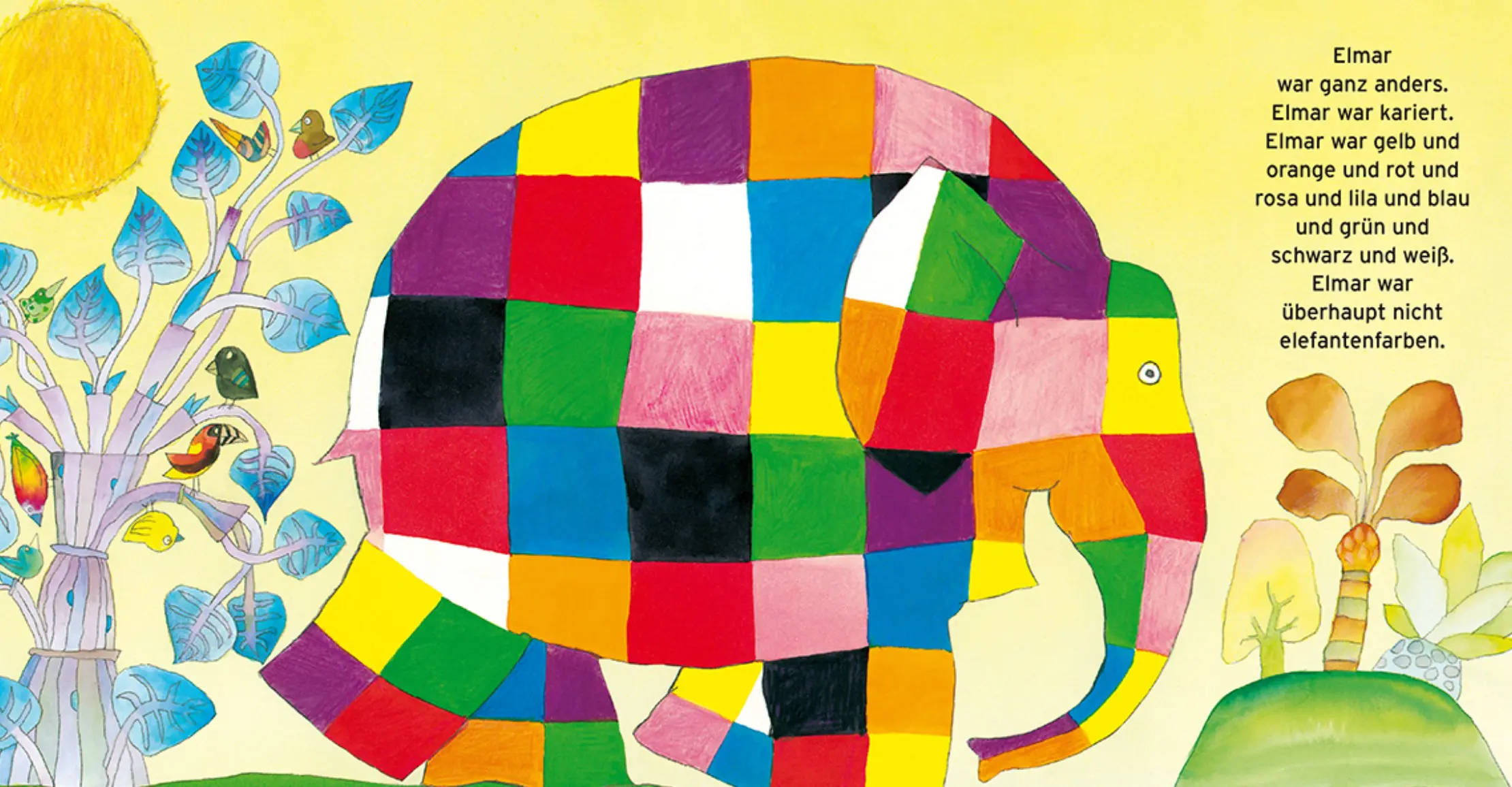 Es war einmal eine Elefantenherde. In der Herde lebten junge und alte Elefanten, große, kleine, dicke und dünne Elefanten. Alle lebten glücklich und hatten die gleiche Farbe. Alle außer Elmar. Elmar war anders. Elmar war bunt und kariert. Elmer war gelb und orange und rot und rosa und lila und blau und grün und schwarz und weiß. Elmar war nicht elefantenfarben. Und es war Elmar, der die Elefanten zum Lachen brachte. Elmar kannte viele Streiche und hatte jede Menge Unfug im Kopf.