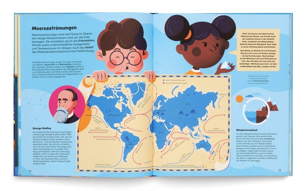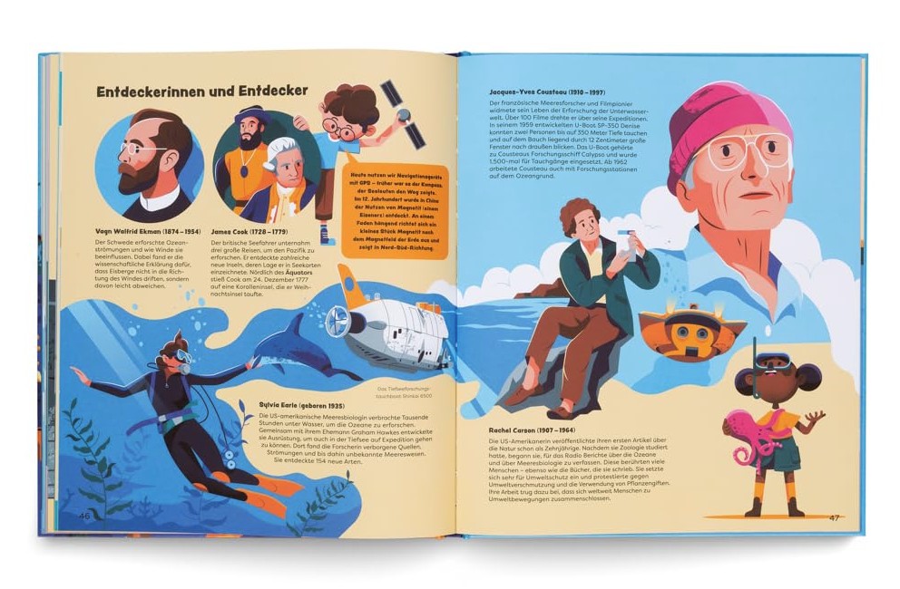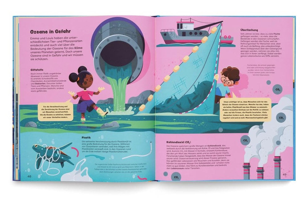 Als Ökosystem sind die Ozeane unersetzlich für das Leben auf der Erde, sie sind Hauptverkehrswege, beherbergen eine unglaubliche Artenvielfalt, versorgen mit Nahrung und Medizin, beeinflussen das Wetter, produzieren Sauerstoff und wirken als Klimaregulatoren. Von der Entstehung und Gezeiten über Küsten und Meeresgräben, Strömungen und Tierwanderungen bis hin zur Nachhaltigkeit und zum Schutz – in „Entdecke die Ozeane: Emmas und Louis’ Abenteuer in der Unterwasserwelt“* taucht Anne Ameri-Siemens tief in die Natur und die Welt des Wassers ein und bietet, in visueller Begleitung mit den wunderschönen Illustrationen von Anton Hallmann, einen spannenden, informativen sowie fantastischen Einblick in die Geographie, Geologie, Biologie und Ökologie der Ozeane und Meere. Ein eindrucks- wie geheimnisvoller und gleichzeitig so elementarer Lebensraum.