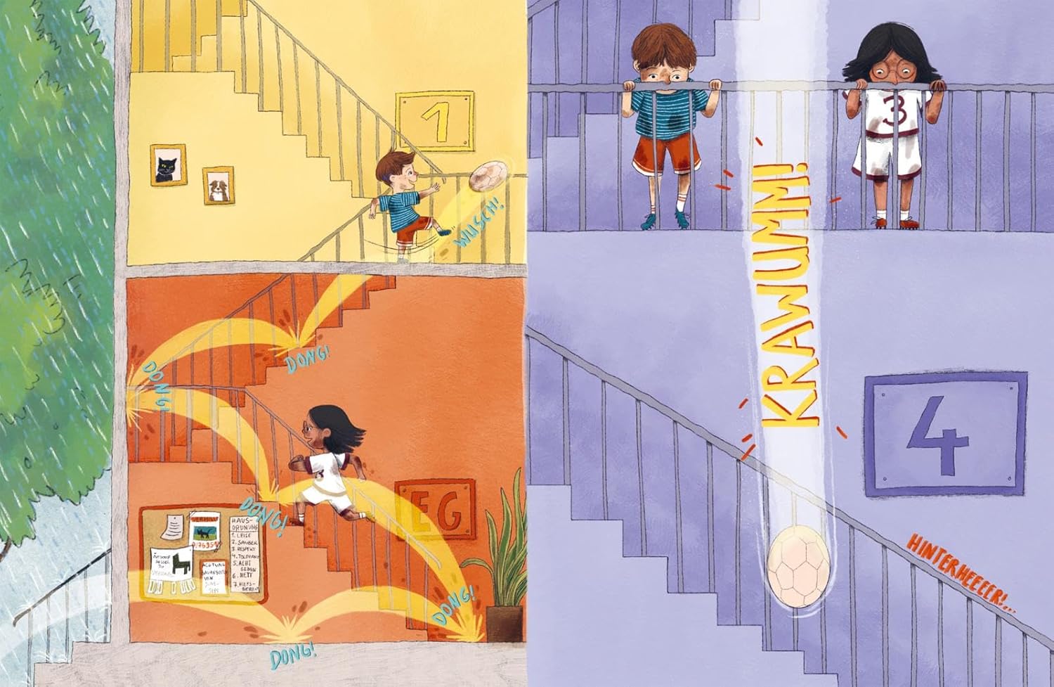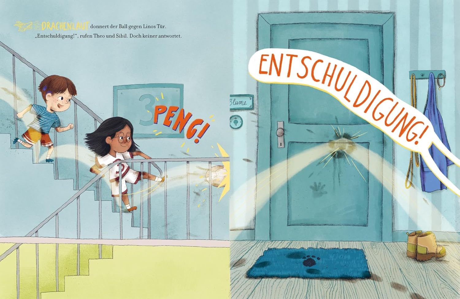 Theo und Sibil spielen Fußball, doch plötzlich fängt es ziemlich doll an zu regnen. Also nichts wie rein ins Haus. Schnell rennen sie mit ihrem Ball die Treppen hinauf. Doch dann passiert es: Der Ball springt über das Geländer und sorgt für ein riesiges Durcheinander. Krawumm! Mit einem lauten Knall prallt er gegen Linos Tür und hinterlässt einen ziemlichen Dreckfleck.
