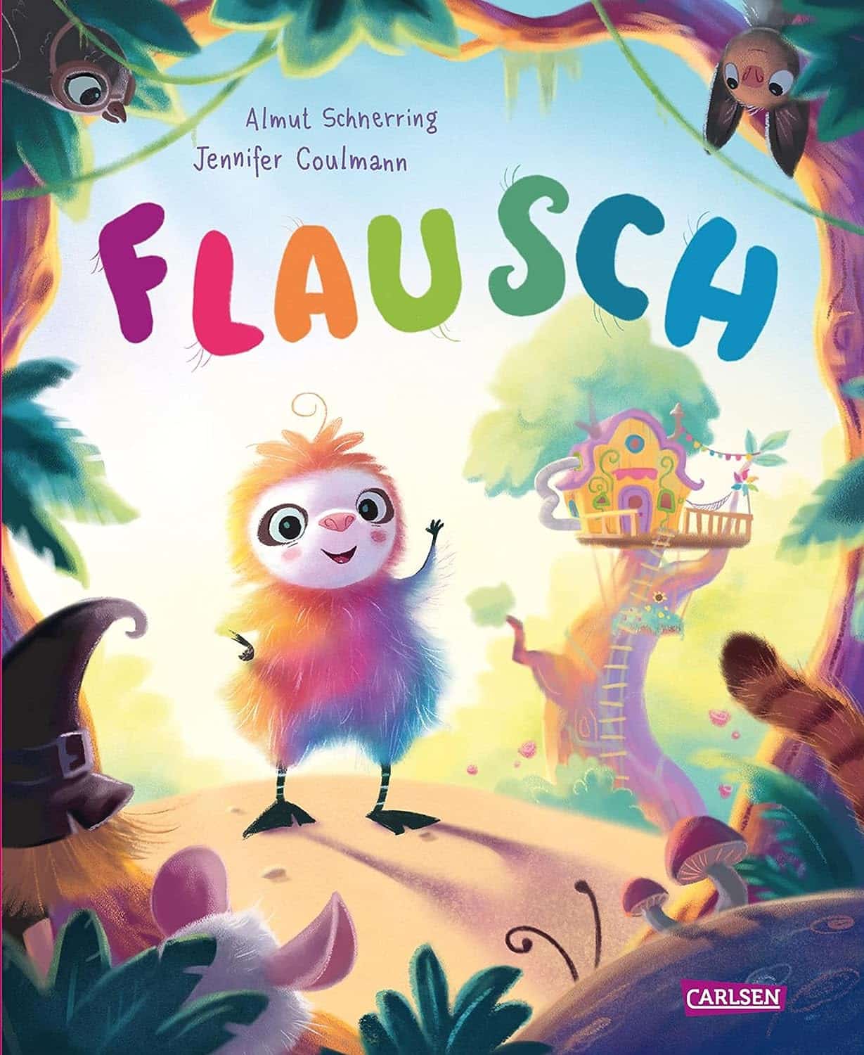 In einem großen Baum auf einer winzigen Waldlichtung wohnt Flausch. Wie jeden Morgen schwimmt Flausch in dem nahegelegenen See eine Runde. Und wie jeden Morgen ist es langweilig so allein. Die anderen halten meist Abstand zu Flausch. Sie meinen es gar nicht böse, sondern wissen einfach nicht, was sie von Flausch halten sollen. Flausch sieht immer anders aus. Mal sind die Haare lang, mal kurz. Manchmal schimmert das Fell rosa, mal flimmert es blau. Und manchen Tagen ist es kunterbunt.