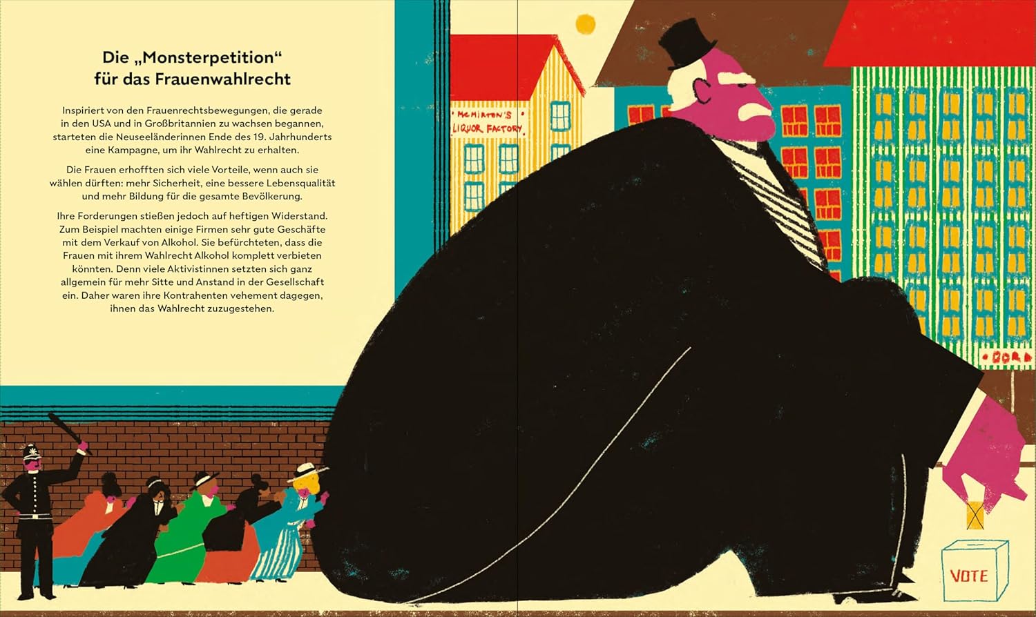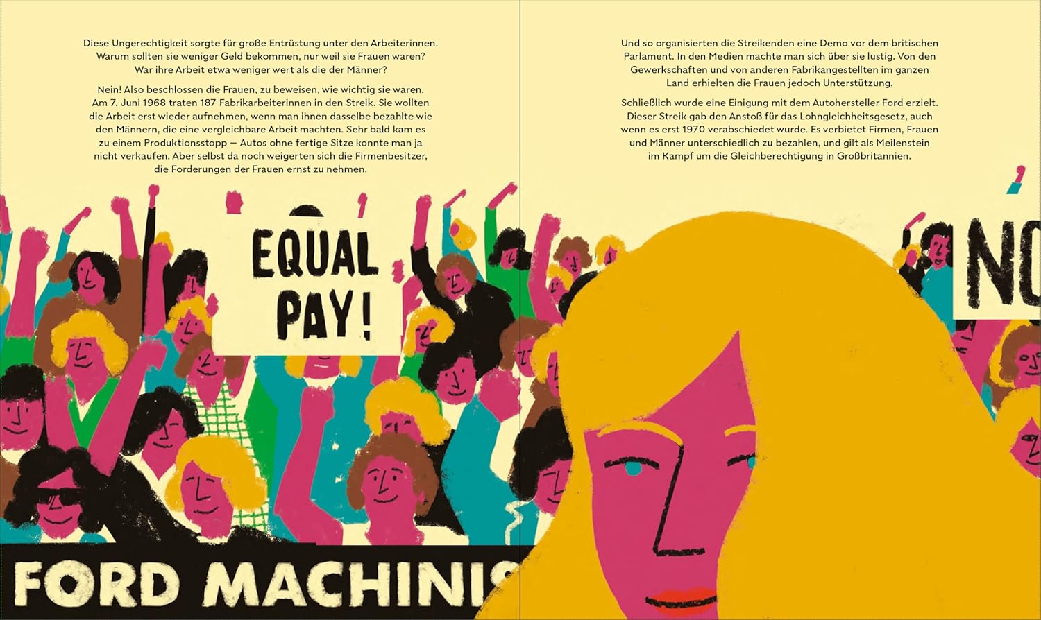 „Frauenpower: Der Kampf um Gerechtigkeit und Gleichberechtigung“* von Rebecca June enthält 13 Erzählungen – „Der Zug der Marktfrauen nach Versailles (Frankreich, 1789)“, „Die „Monsterpetition“ für das Frauenwahlrecht (Neuseeland, 1893)“, „Der Aufstand der Frauen (Spanien, 1918)“, „Der Marsch der Frauen in Pretoria (Südafrika, 1956), „Der Näherinnenstreik in den Ford-Werken (England, 1968)“, „Die Mütter der Plaza de Mayo (Argentinien, 1977)“, „Die Guerilla-Girls (USA, 1985)“, „Frauen ans Steuer! (Saudi-Arabien, 1990)“, „Die singenden Nonnen (Tibet, 1993)“, „Der Erfolg von #MeToo (USA/weltweit, 2006)“, „Die Soulaliyate und der Kampf um ihr Land (Marokko, 2007)“, „Der Schwarze Montag (Polen, 2016)“ sowie „Jin, Jiyan, Azadî – „Frau, Leben, Freiheit“ (Iran, 2022)“ – über Proteste und Aktivismus von Frauen, die chronologisch aufgebaut von der Vergangenheit bis zur Gegenwart reichen. Kraftvoll bildlich von Ximo Abadía in Szene gesetzt. Sie zeigen, dass es wichtig und richtig ist, sich zu engagieren, um ein individuelles sowie gesellschaftliches Leben ohne Differenz, Ausbeutung, Abwertung, Gewalt, Unterdrückung, Ungleichheit, Diskriminierung und Benachteiligung zu gestalten. Für eine Welt, in der alle Menschen sicher, frei und selbstbestimmt leben können.