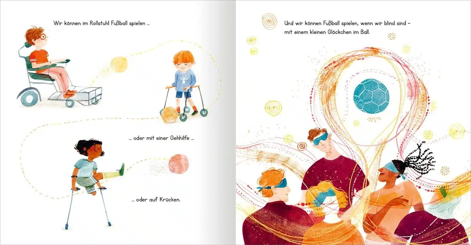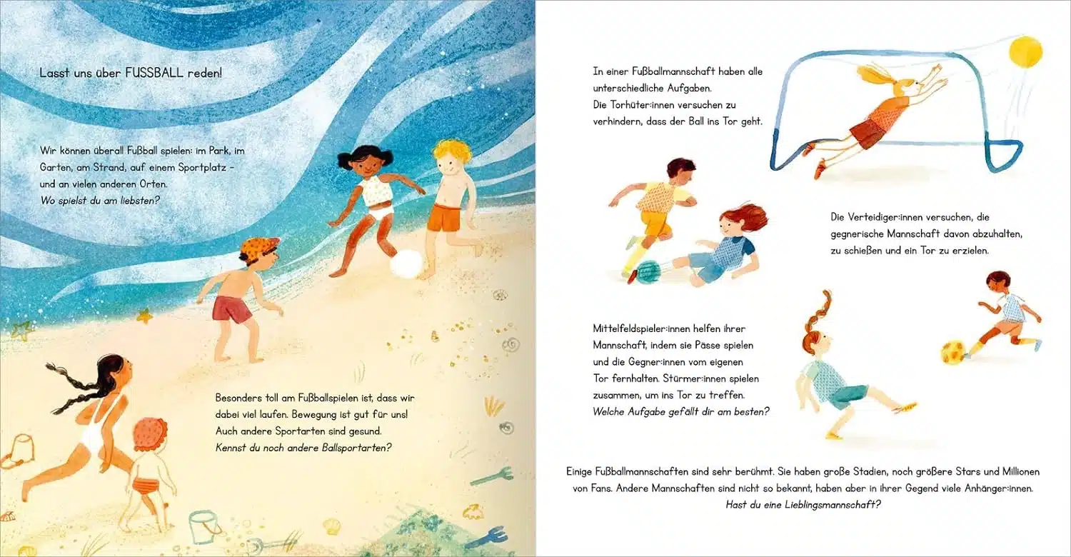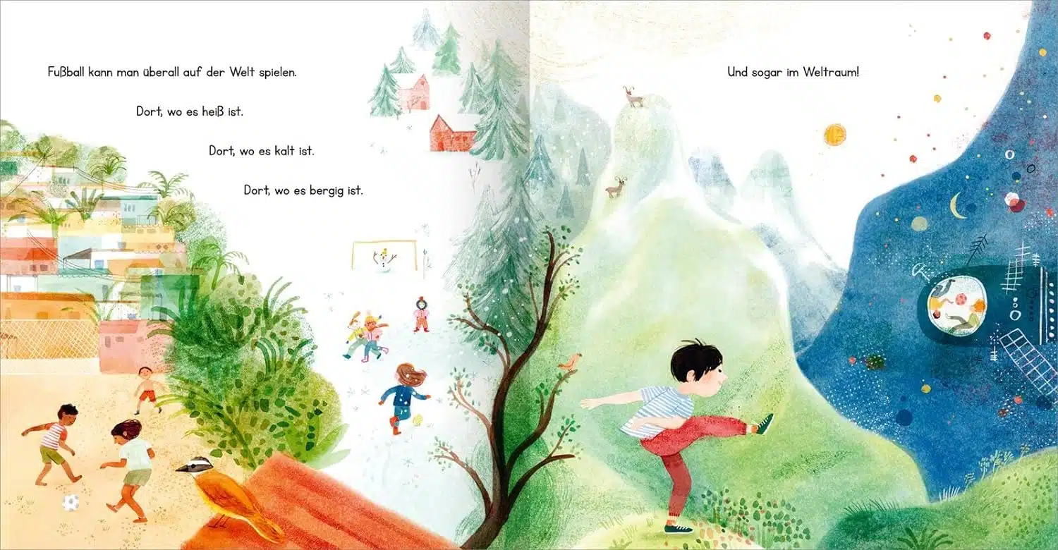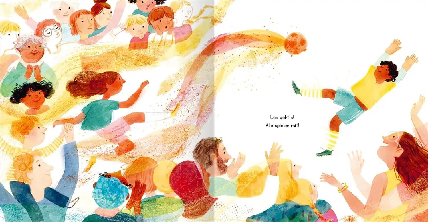 In „Fußball – Alle spielen mit“* widmet sich Ben Lerwill der wohl schönsten Nebensache, natürlich beliebtesten Sportart der Welt. Und das ganz Abseits von Superstars, Regelwerk, Leistung oder die Vorstellung von Vereinen. Er zeigt Fußball als verbindendes Element, welches Orte für Gemeinschaft und Zusammenhalt schafft und Menschen – ganz unabhängig von Alter, Geschlecht, Kultur, Herkunft, Status oder Fähigkeiten – weltweit im und um das Spiel vereint. Und das Faszinierende daran ist, dass es genau dafür nicht viel braucht. Beeindruckend von Marina Ruiz im Bild festgehalten. Eine spielend leichte und wundervolle Liebeserklärung an den Fußball in Bilderbuchform.