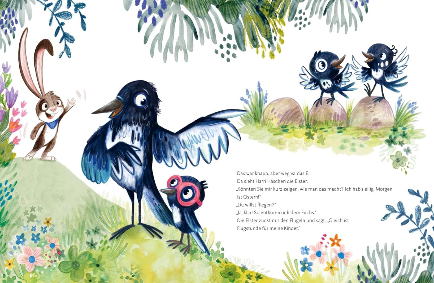 Harri macht sich auf den Weg zu den Hühnern, um neue Eier zu holen. Doch der Weg ist lang. Als er Familie Elster trifft, kommt ihm eine Idee: Fliegen, wie praktisch das wäre! Und Harri probiert es aus. Ohren drehen, schütteln, Schwung holen – und auf einmal hebt er ab! Hin und her, hoch und runter saust er nun durch die Luft. Damit ihm die Eier nicht aus den Pfoten rutschen, knotet er sein Tuch zu einem Beutel. Alle Eier hinein und ab nach Hause, damit das Osterfest stattfinden kann…