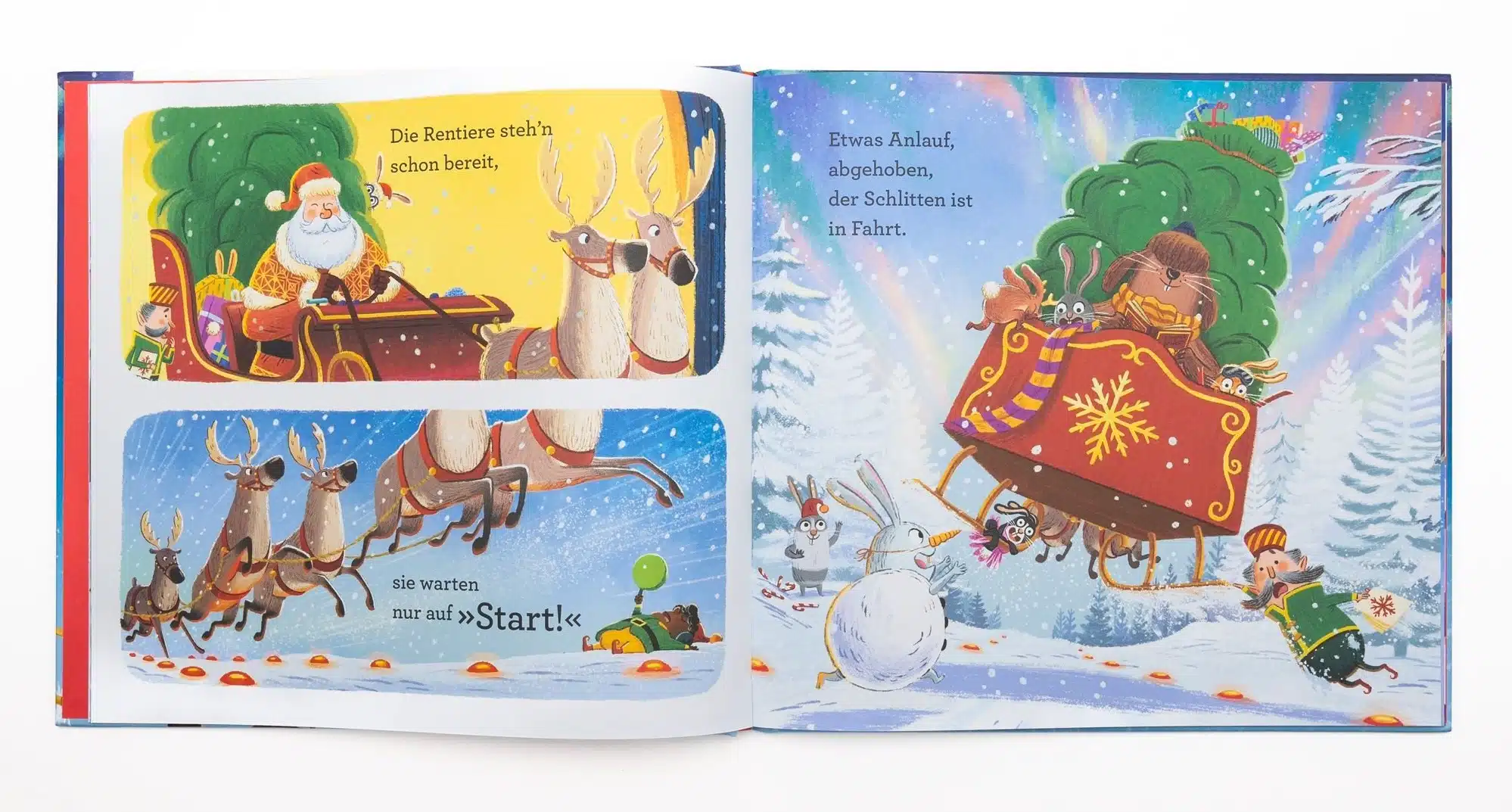 In dem Moment kommt eine Hasenbande angerast. Mit Begeisterung hopsen sie in den Schlitten. Ab die Fahrt! Nach der Landung auf dem ersten Dach folgen die Hasen dem Weihnachtsmann. Eins nach dem anderen schlüpft hinter ihm durch den Kamin und kommt mit Ruß von Fuß bis Ohr heraus. Die die Bande verteilt sich munter wie Geschenke und das lebhafte Treiben geht von Haus zu Haus weiter. Die Hasen schwärmen aus, erkunden, testen und probieren…