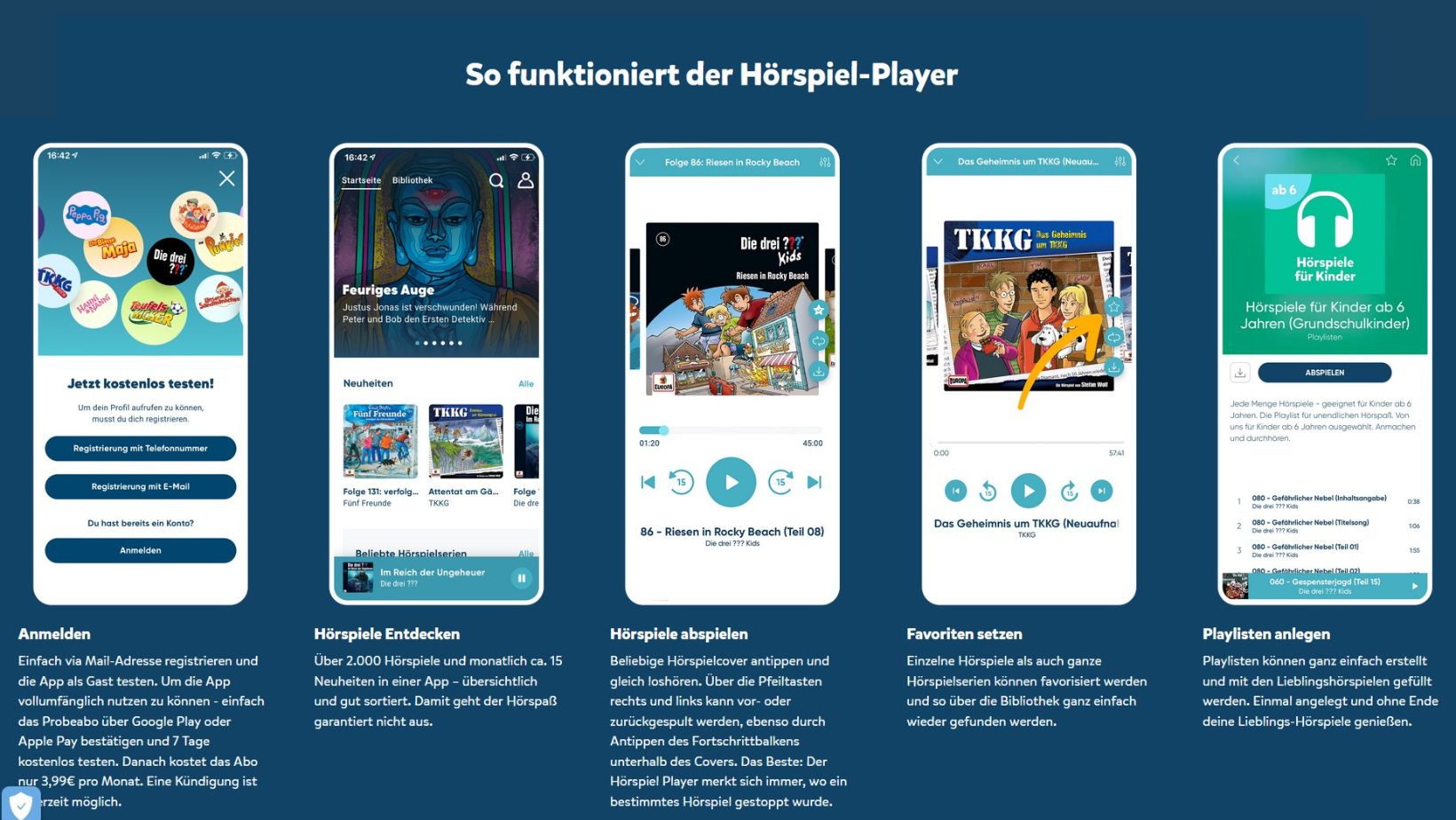 Erhältlich ist die Hörspiel-App von EUROPA im „App Store“* und bei „Google Play“*. Das Abonnement ist monatlich jederzeit kündbar. In der kostenlosen Probezeit kann das Streamingportal ausgiebig getestet und ausprobiert werden. Alle Hörspiele im Hörspiel Player können unbegrenzt gehört werden. Ob gemütlich auf der Couch, abends im Bett vor dem Einschlafen oder im Auto: so oft und so lange, wann und wo auch immer, ihr wollt. Eine Nutzung offline ist ebenfalls möglich: Nach dem Herunterladen der Hörspiele kann diesen auch ohne Internet- oder WLAN-Verbindung gelauscht werden. Nutzbar ist die App für bis zu drei Hörer:innen gleichzeitig (für bis zu zwei Kinder können individuelle Profile angelegt werden). Ein Sleeptimer mit integrierter Lautstärkenregelung ermöglicht das Programmieren eines gewünschten Abschaltzeitpunktes und eine Kindersicherung sorgt für eine rundum sichere Hörspielumgebung.