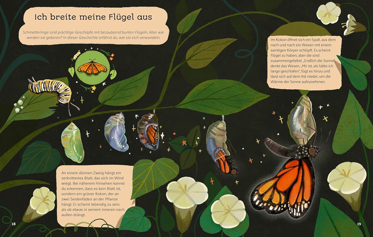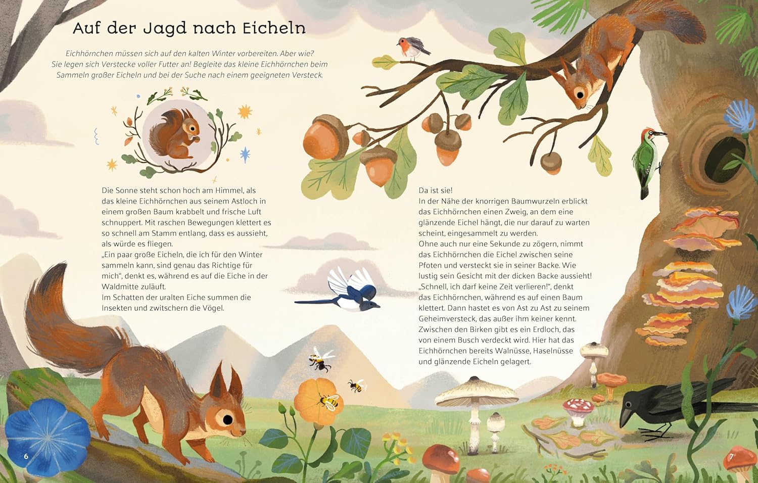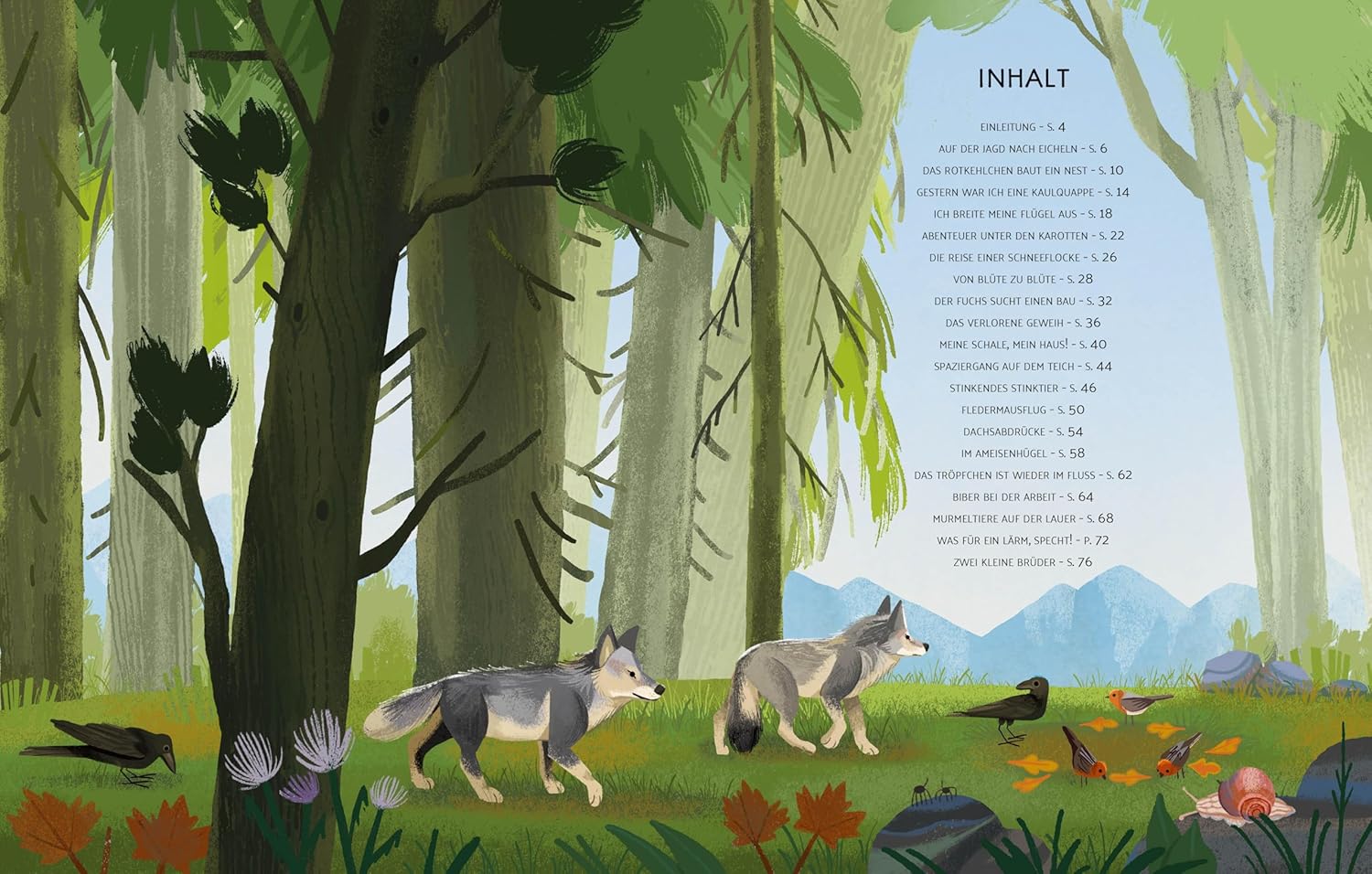 Mitten in der Natur ereignen sich jeden Tag spannende, abenteuerliche, zauberhafte, inspirierende, wundervolle, unglaubliche, faszinierende sowie aufregende Geschichten. Da ist die Fledermaus, die sich per Echoortung durch die Nacht navigiert oder die Raupe, die zu einem Schmetterling wird. Da sind die Bienen, deren leises Summen die Luft erfüllt oder der Maulwurf, der mit seinen Pfoten lange Tunnel gräbt. Da sind die Ameisen, deren Hügel Städten ähnlich sind oder der Specht, der mit seinem Schnabel Löcher in den Stamm von Bäumen bohrt: „Kleine Geschichten aus der Natur“…