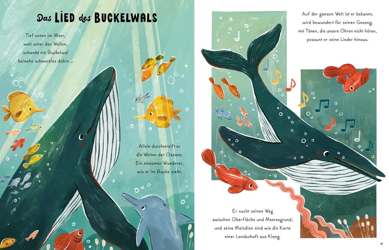 Tief unten im Meer gleitet der Buckelwal fast schwerelos durch das Wasser und singt seine Lieder, um mit anderen Walen in den Weiten des Ozeans zu kommunizieren. So bleibt der Kontakt selbst in den dunklen und weiten Tiefen des Meeres erhalten. Auch Weibchen können Laute erzeugen, doch nur die Männchen singen diese komplexen Gesänge, die aus einer Vielzahl unterschiedlicher Geräusche bestehen. Sie bilden Muster und wiederkehrende Melodien.