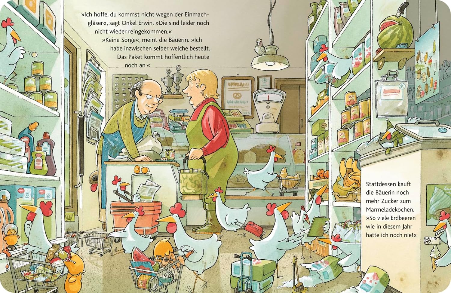Am Ende bleibt nur noch das Paket der Bäuerin übrig. Doch auf dem Bauernhof angekommen, ist die Bäuerin nicht da, und merkwürdigerweise ist auch das Paket für sie verschwunden. Lieselotte und der Postbote suchen wirklich überall. Sie laufen zurück ins Dorf, aber nirgends eine Spur von dem Paket. In Onkel Erwins Tante-Emma-Laden erfahren sie, dass die Bäuerin Einmachgläser bestellt hat. Da hat Lieselotte eine Idee…