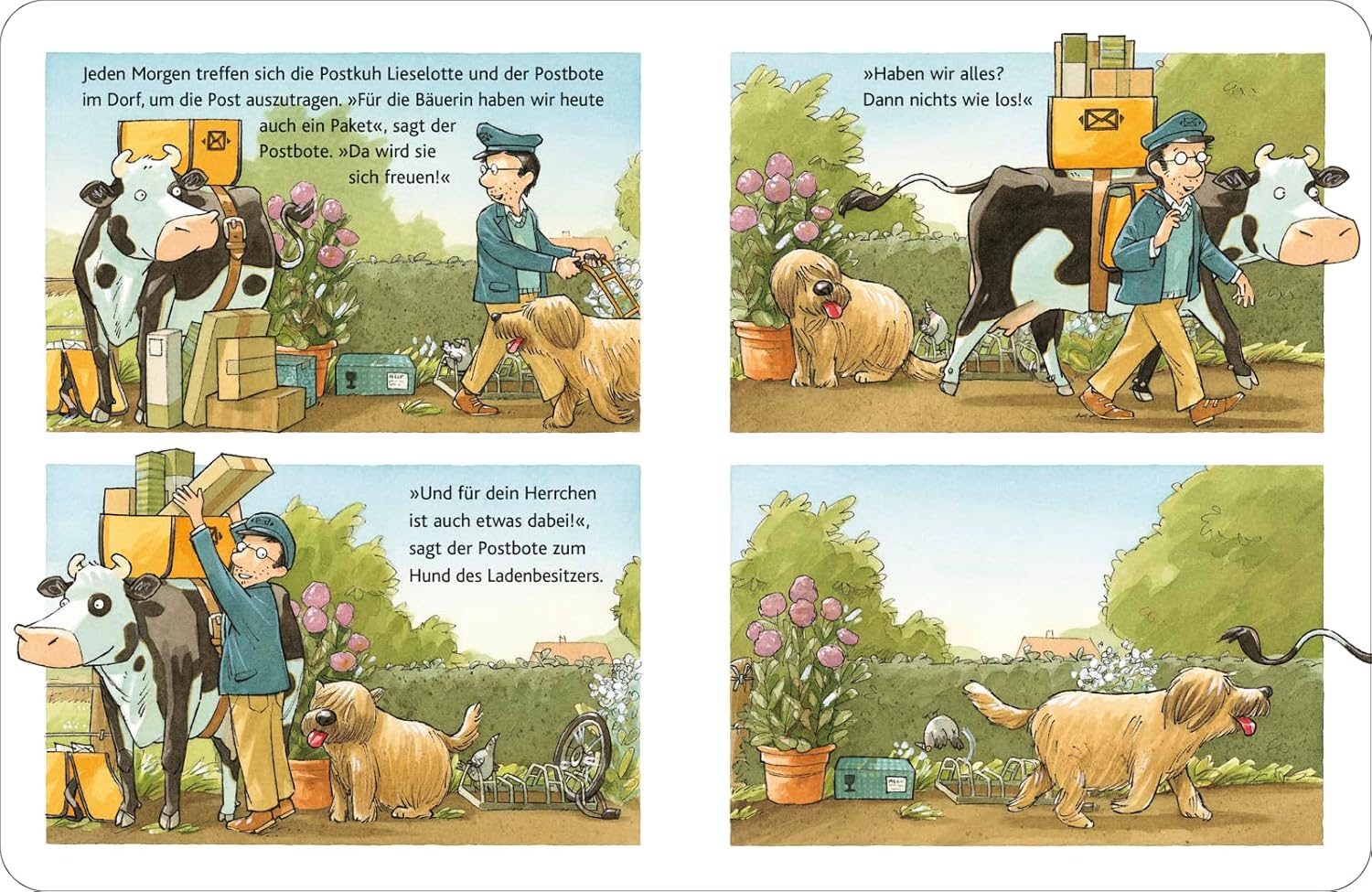 Jeden Morgen treffen sich die Postkuh Lieselotte und der Postbote im Dorf, um die Post auszutragen. Für die Bäuerin ist diesmal ein Paket dabei, und auch für den Ladenbesitzer eines. Zusammen machen sie sich auf den. Weg. Ihr erstes Ziel ist Onkel Erwins Laden, wo sie das erste Päckchen abgeben. Auch die anderen Bewohnerinnen und Bewohner des Dorfes freuen sich über die Post.