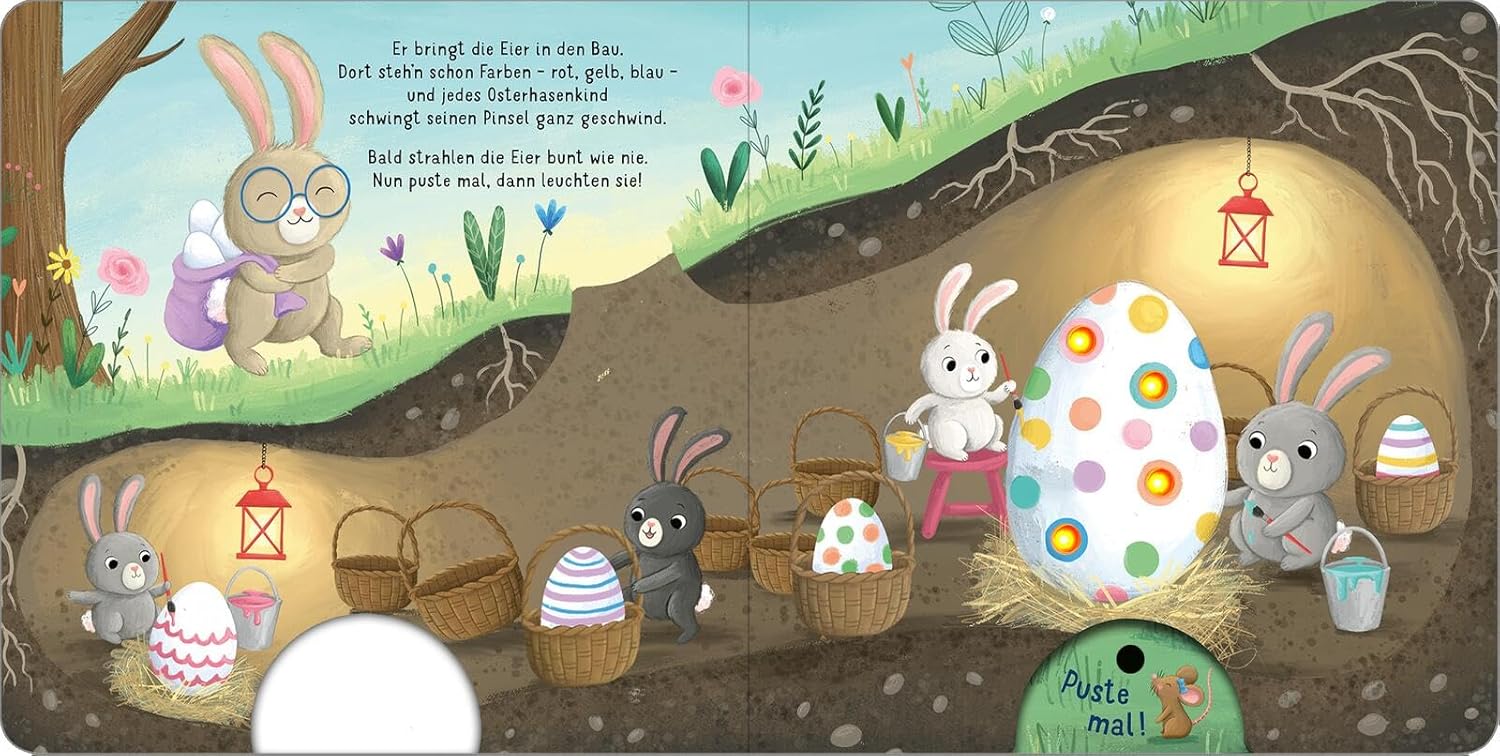 „Mein liebstes Pustebuch – Frohe Ostern!“: Ostern steht vor der Tür! Die Osterhasenfamilie ist mitten in den Vorbereitungen. Im Hasenbau stehen schon die Farben und Pinsel bereit. Schnell werden noch die Eier von den Hühnern abgeholt, um sie kunterbunt zu bemalen. Farbenfroh-leuchtend zieren die dann die Osterkörbchen, die überall als Überraschung für die Tiere zum Osterfest versteckt werden…