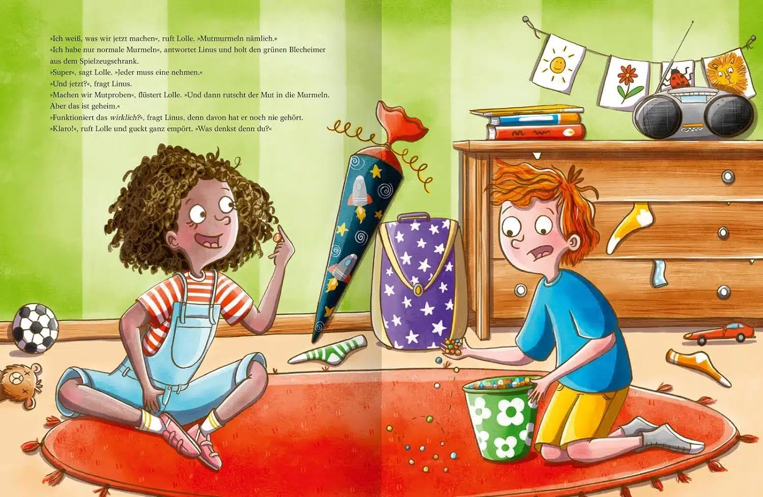 Noch einmal schlafen, dann kommen Lolle und Linus in die Schule. Lolles Bauch fühlt sich darum an, als würden tausend Murmeln darin raumsauen. Als sie Linus davon erzählt, merkt er es auch. Und er stellt besorgt ganz viele Fragen. Doch Lolle weiß Antwort und hat eine richtig gute Idee: Sie machen sich einfach Mutmurmeln! Wenn sie Mut beweisen, rutscht dieser in die Murmel. Aufgeladen dann in die Hosentasche stecken, bei Bedarf drücken und schon geht der Mut über. Linus ist überzeugt.