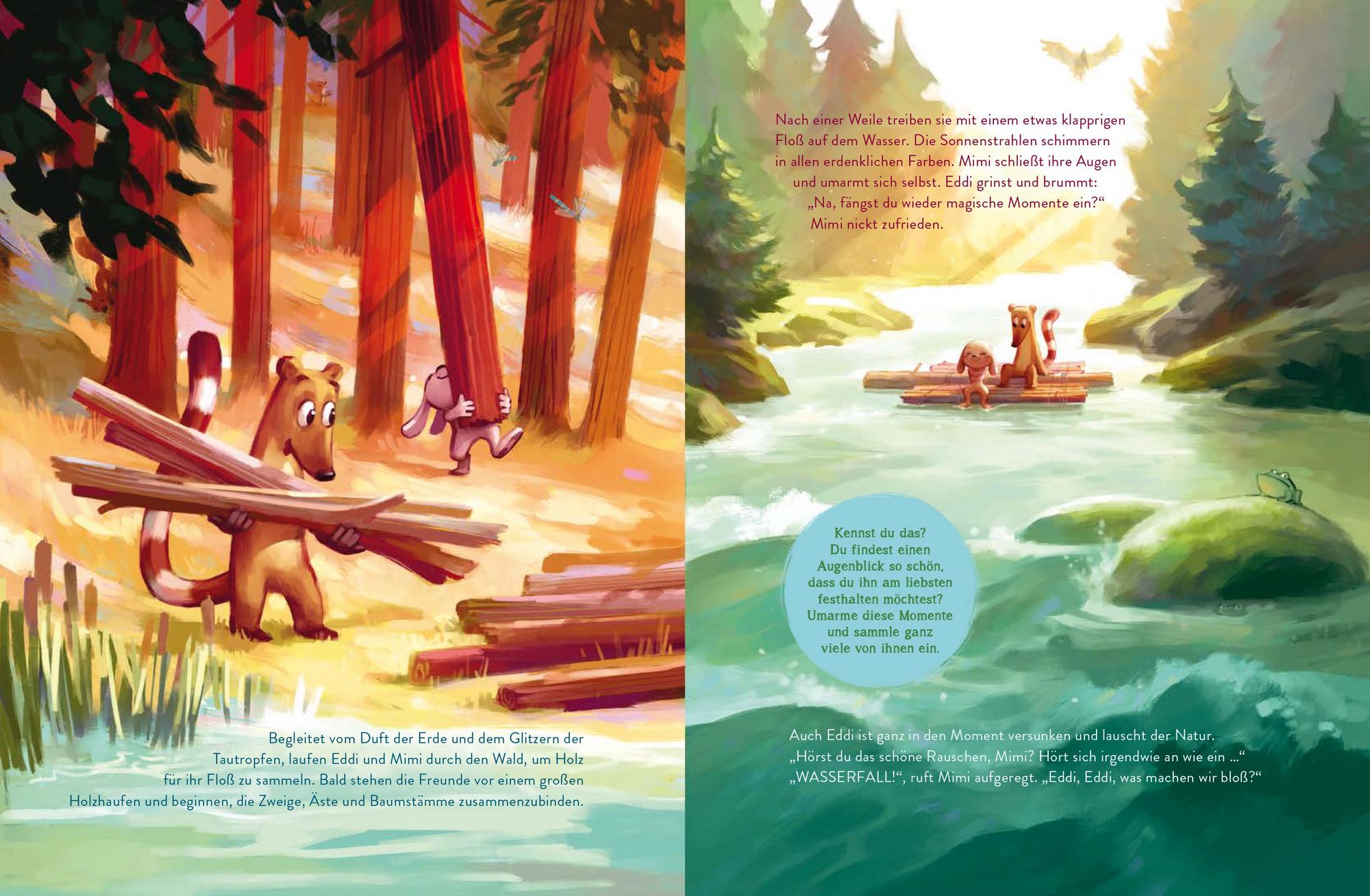 Häsin Mimi und Nasenbär Eddi sind die besten Freunde. Oft sind sie zusammen im Wald unterwegs, denn hier gibt es immer wieder Neues zu entdecken: Ob der Duft von Erde, die Sonnenstrahlen in allen erdenklichen Farben, das Glitzern der Tautropfen, das Tanzen der Blätter oder das Leuchten der Glühwürmchen – „So fängst Du einen Augenblick“…