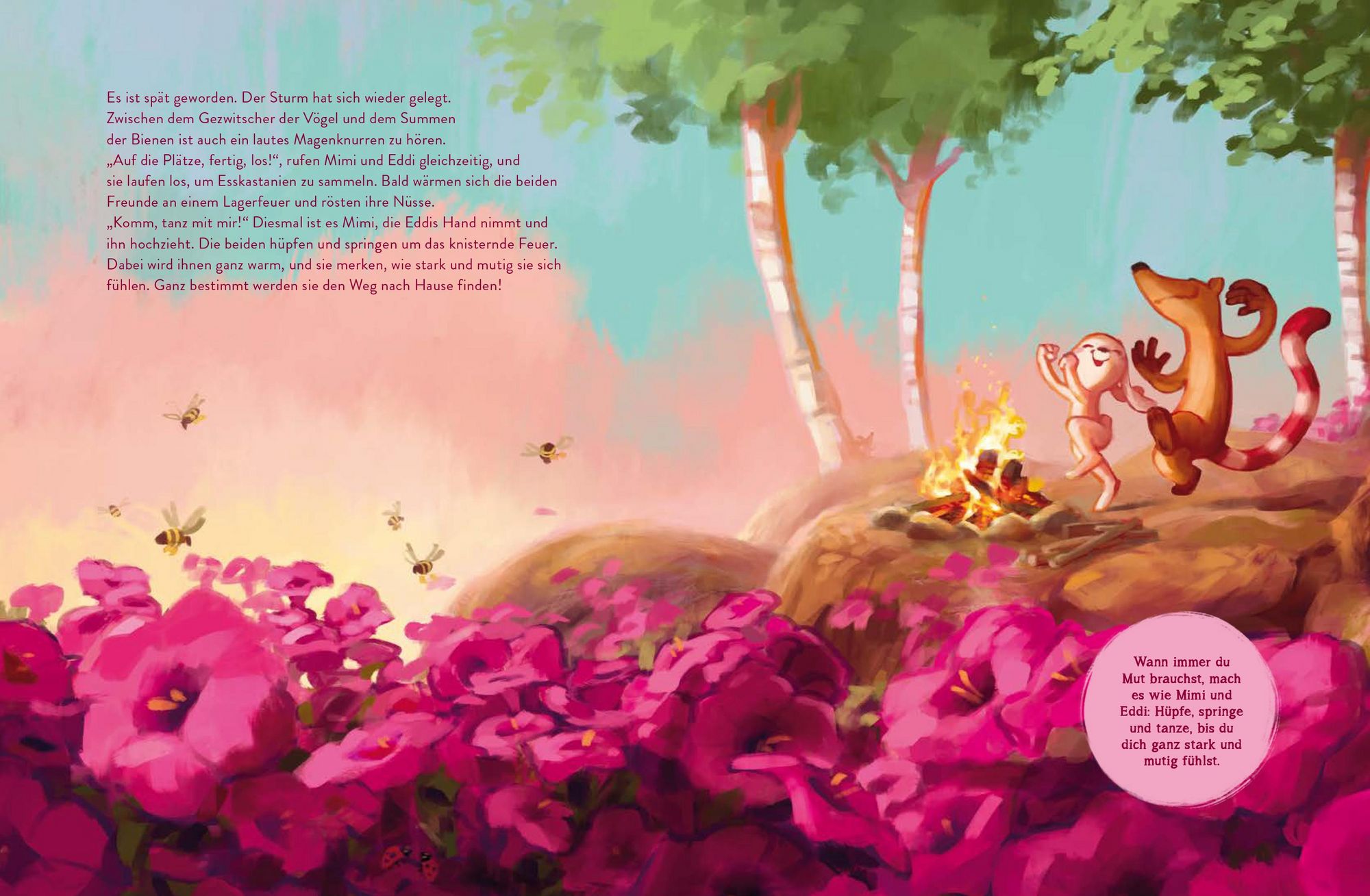 Als plötzlich ein Wasserfall auftaucht, fliegen sie mit einem Reiher wieder zurück den Wald. Ein Glück, denn ein Sturm zieht auf. Ein Meer aus Blättern weht um Mimi und Eddi herum. Als Mimi Angst hat und weint, hält Eddi sie fest. Während sich der Wind wieder legt, sammeln sie Esskastanien, um diese am Lagerfeuer zu rösten. Danach nimmt Mimi Eddis Hand und zieht ihn hoch. Sie hüpfen, tanzen und springen um das Feuer. Als es dunkel wird, machen sie sich die beiden begleitet vom hellen Leuchten der Glühwürmchen auf den Weg nach Hause…