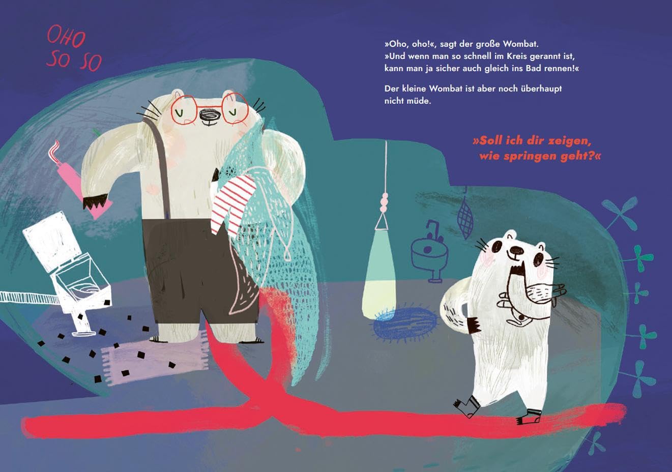 Es ist wirklich früh. Der große Wombat gähnt. Zeit zum Schlafengehen. Dabei hat der kleine Wombat gerade noch so viel Spaß am Tunnelgraben und beim Spielen. Er hat eine Idee! Er zeigt dem großen Wombat wie „rennen“ geht. Und wenn der kleine Wombat so gut im Kreis rennen kann, kann er auch gleich ins Bad rennen, findet der große Wombat.