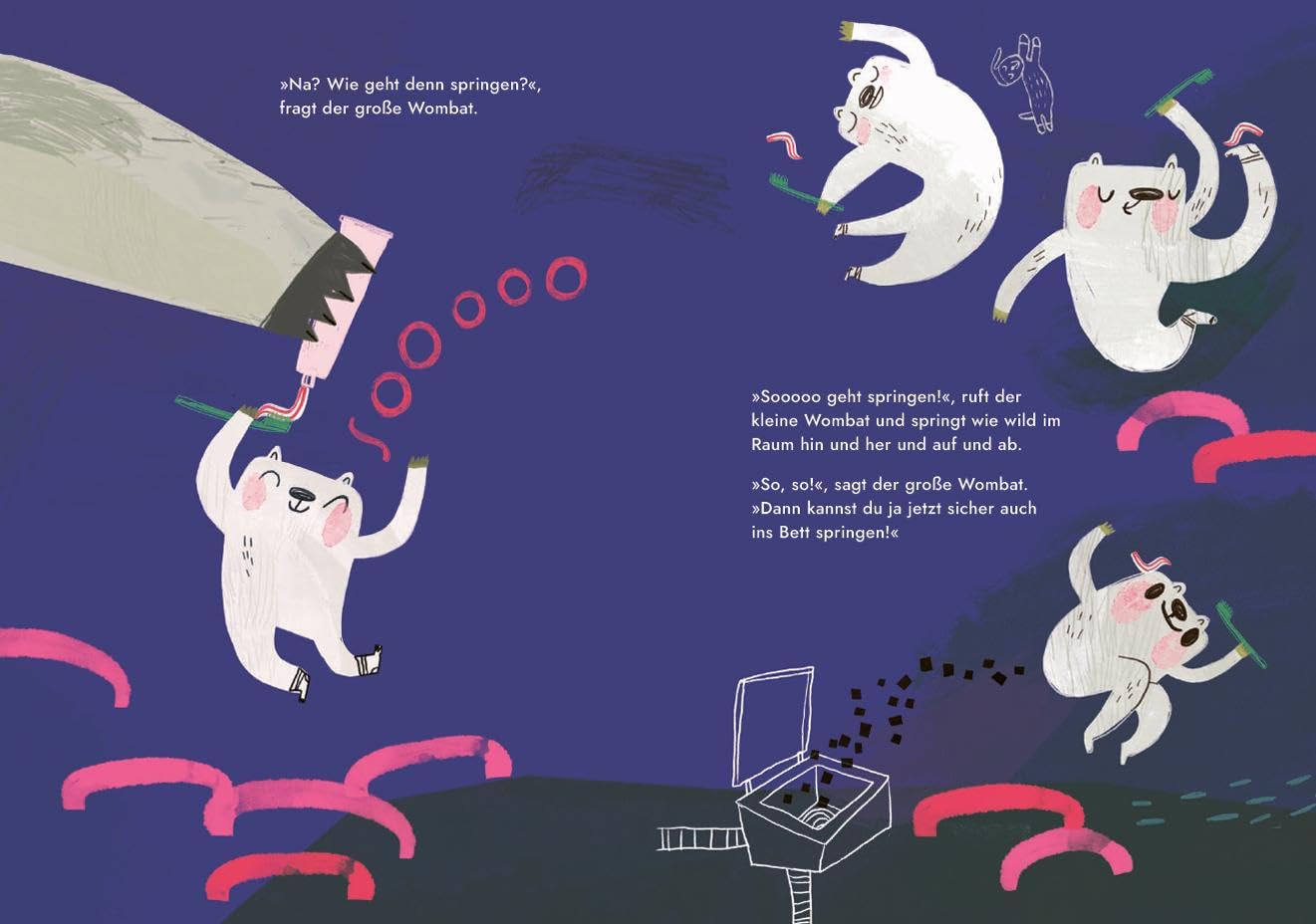 Nach dem Zähneputzen springt der kleine Wombat auf und ab, hin und her. Na, wer so gut springen kann, schafft es bestimmt auch ins Bett zu hüpfen. Im Bett rollt der kleine Wombat kreuz und quer. Da ist es gar nicht so einfach, den Schlafanzug anzuziehen. Aber, wenn er so gut rollen kann, ist es doch auch sicher möglich, dass der kleine Wombat sich in die Decke rollt. Nun hat er dem großen Wombat alles gezeigt, was er kann. Er reibt sich die Augen. Aber da fällt ihm noch etwas ein…