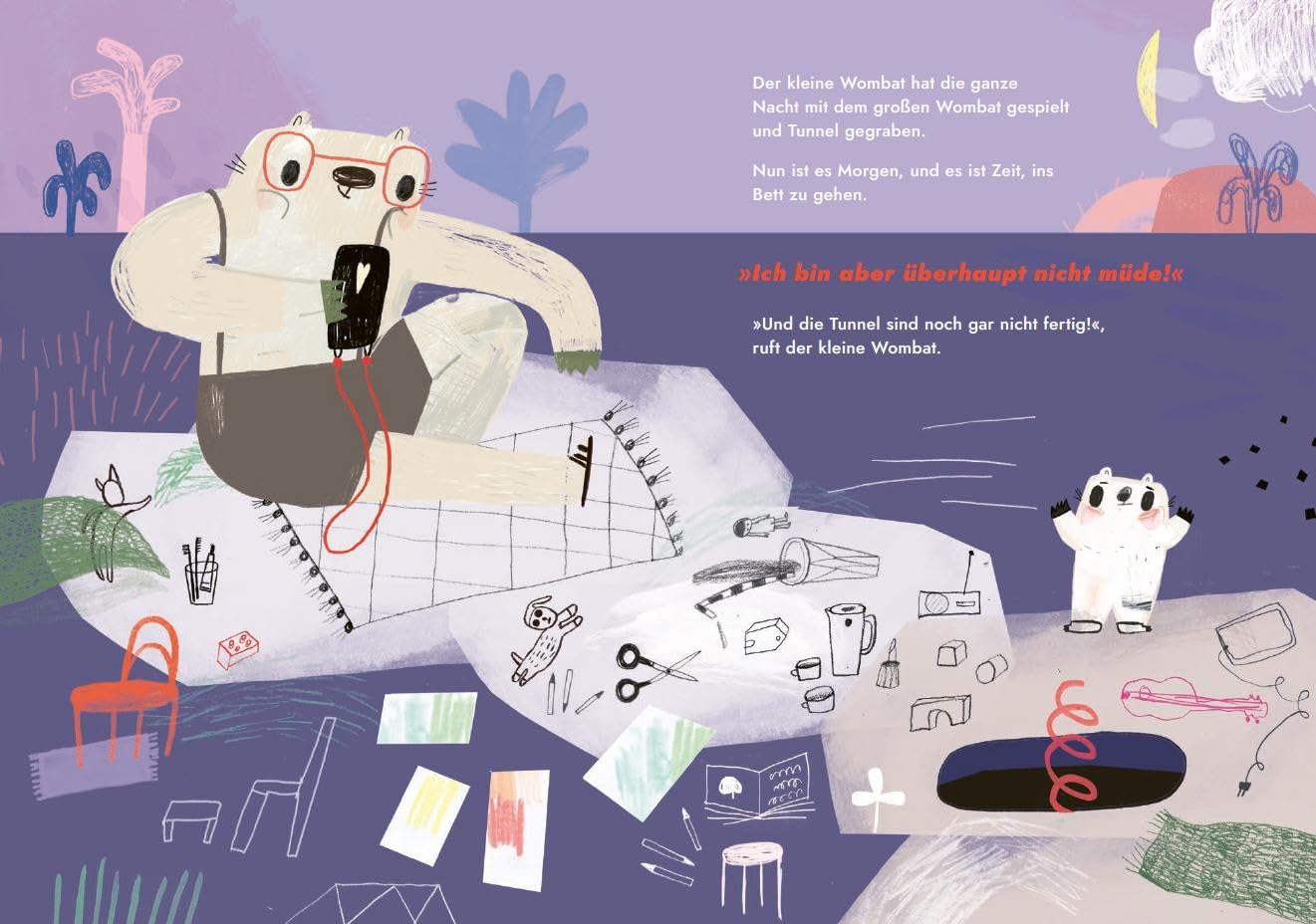 „So geht schlafen, kleiner Wombat“: Der kleine Wombat hat die ganze Nacht über mit dem großen Wombat gespielt und Tunnel gegraben. Nun ist es Morgen, und damit Zeit, ins Bett zu gehen. Aber der kleine Wombat ist überhaupt nicht müde. Ganz gar nicht! Die Tunnel sind noch nicht fertig, und er hat ganz, ganz viele Ideen. Der kleine Wombat möchte dem großen Wombat noch so viel zeigen…