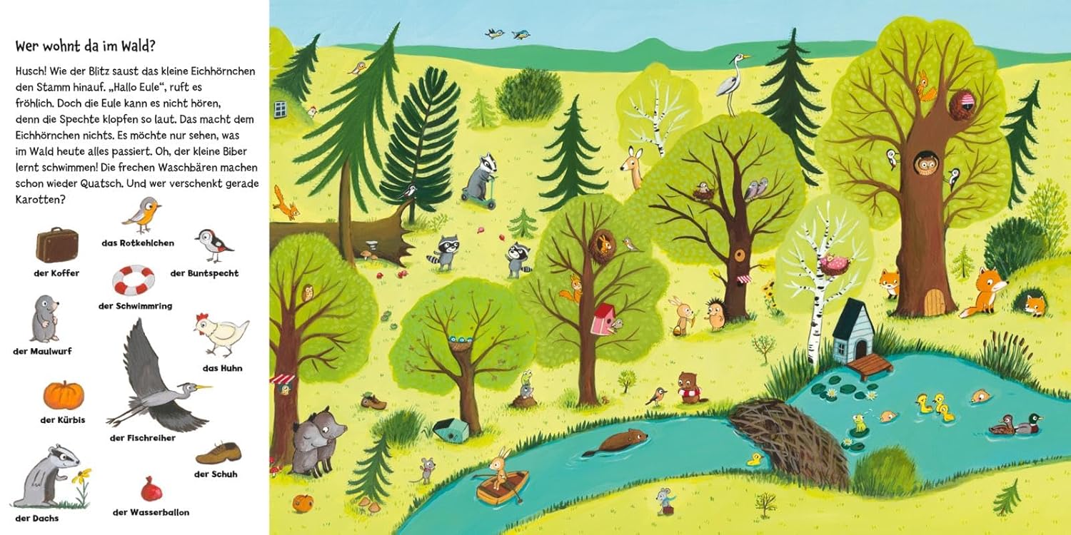 „Was machen die kleinen Tiere?“ – Ob Regenmöhrensuppe, Verkleidungsfest, Käseumzugsschmaus, Nussgerangel oder Quatschmatsch: Für die Waschbärenkinder wird der Wald bei Regenwetter zu einem Abenteuerspielplatz, die Maus ist unterwegs auf Haussuche, die Meisen brauchen Pustehilfe und Hase, Igel und Eichhörnchen feiern auf ganz fantasievolle Weise…