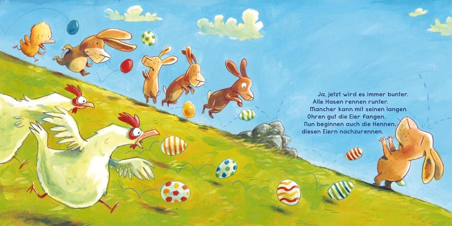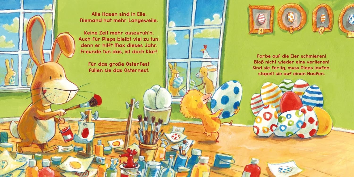 Osterhase Max und Pieps haben eine Menge zu tun. In der Werkstatt herrscht viel Betrieb, um alles für das Osterfest vorzubereiten. Überall stehen Farbtöpfe, Pinselbecher und Körbe voller Eier herum. Ei für Ei wird kunterbunt bemalt. Die fertig bemalten Eier stapelt Pieps auf einen Haufen. Doch genau diesen stößt er mit einem Mal unabsichtlich um, und alles kommt in Bewegung: „Wo rollen all die Eier hin?“. Ob Max und Pieps die wieder rechtzeitig bis zum Osterfest einsammeln können?