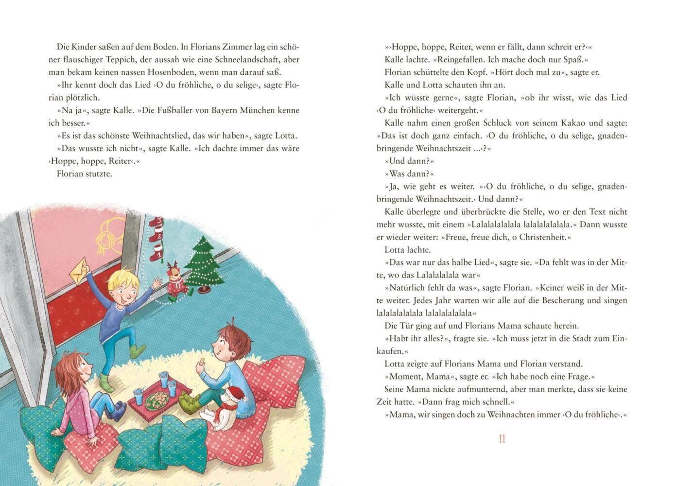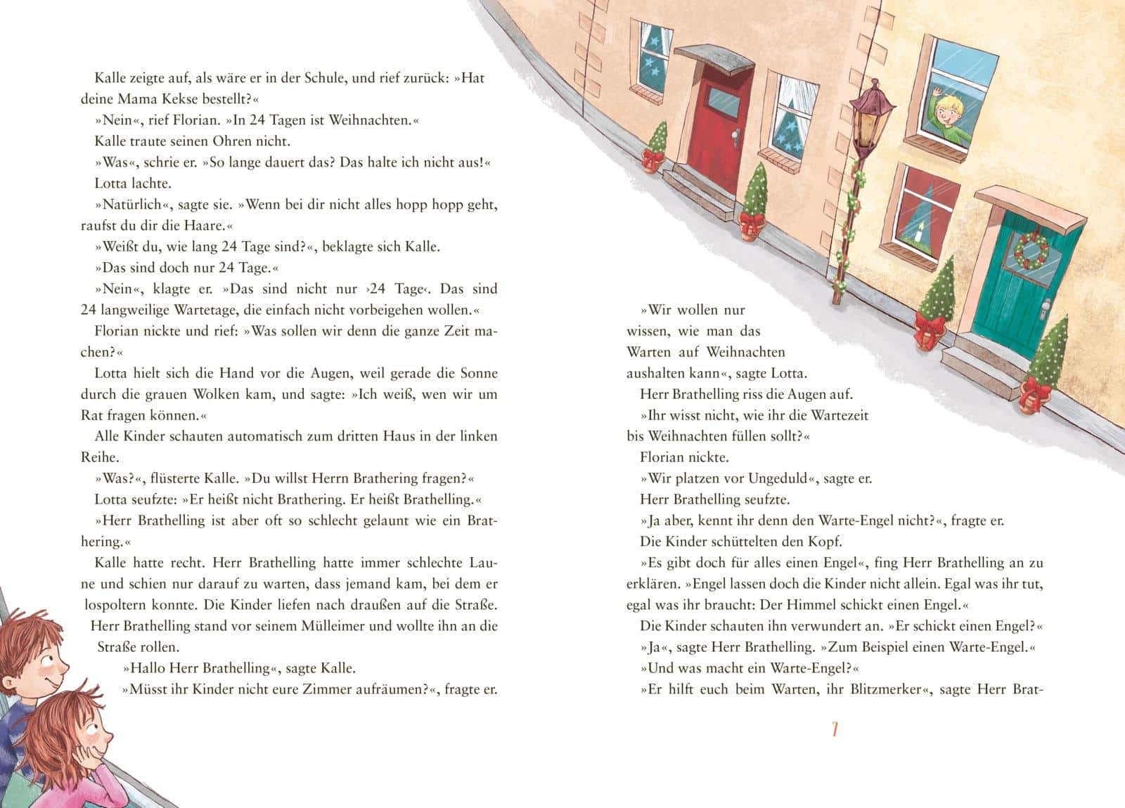Es ist die Zeit vor Weihnachten. Überall funkeln in den Straßen Lichter. Alles ist geschmückt und glitzert. Man spürt den Zauber, der über der kleinen Stadt liegt. Auch in der Siedlung, bestehend aus sechs Häusern, in der die Geschwister Kalle und Lotta sowie ihr Freund Florian wohnen. Bald ist Heiligabend. Doch bis dahin sind es noch 24 Tage. 24 lange Wartetage, die einfach nicht vorbeigehen wollen. Was sollen sie denn nur die ganze Zeit machen?