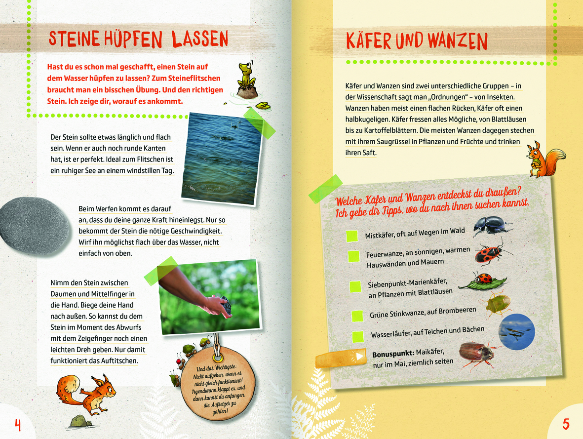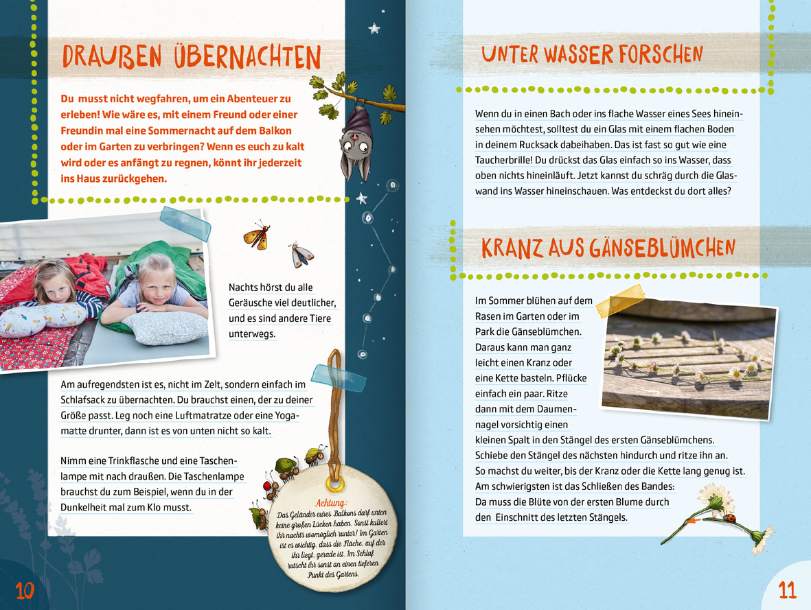 Eine feste Reihenfolge ist dabei nicht vorgegeben, und manche Outdoor-Expeditionen sind nur im Frühling, Sommer, Herbst oder Winter durchführbar. Doch dank seines handlichen Formates passt das Buches jederzeit in den Rucksack und kann das ganze Jahr über mitgenommen werden. Abenteuer warten überall. Die fünfzig kindgerechten Anregungen sind sehr abwechslungsreich und gut umsetzbar. Optisch ergänzt werden sie mit vielen Fotos und wundervollen Illustrationen von Stefanie Reich.