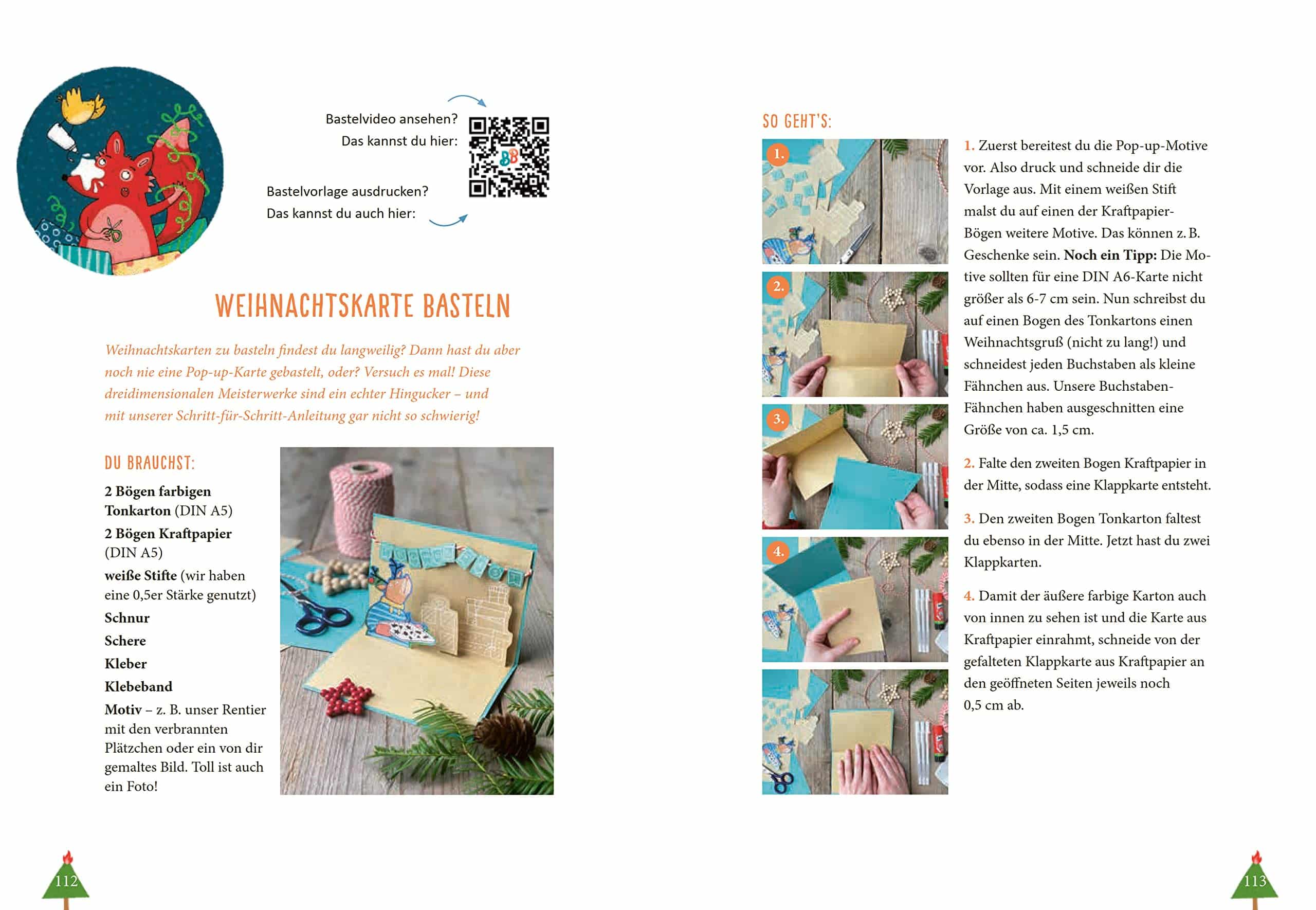 Eine Weihnachtskarte ist ein schöner Gruß in der Weihnachtszeit. Besonders einmalig und persönlich wird solch eine Karte, wenn sie selbstgebastelt ist. Wie wäre es mit einem richtigen Highlight? Mit einem Pop-Up-Element wird die Weihnachtskarte zu einem Hingucker. Benötigt dafür werden: 2 Bögen farbigen Tonkarton (DIN A5), 2 Bögen Kraftpapier (DIN A5), weiße Stifte, Schnur, Schere, Kleber, Klebeband und ein Motiv wie beispielsweise ein gemaltes Bild oder ein Foto. Die Schritt-für-Schritt-Anleitung für eine Pop-Up-Weihnachtskarte findet ihr im Buch oder auch hier: https://buchstabenbande.com/basteln/bastelideen-zu-weihnachten/pop-up-weihnachtskarte-basteln/