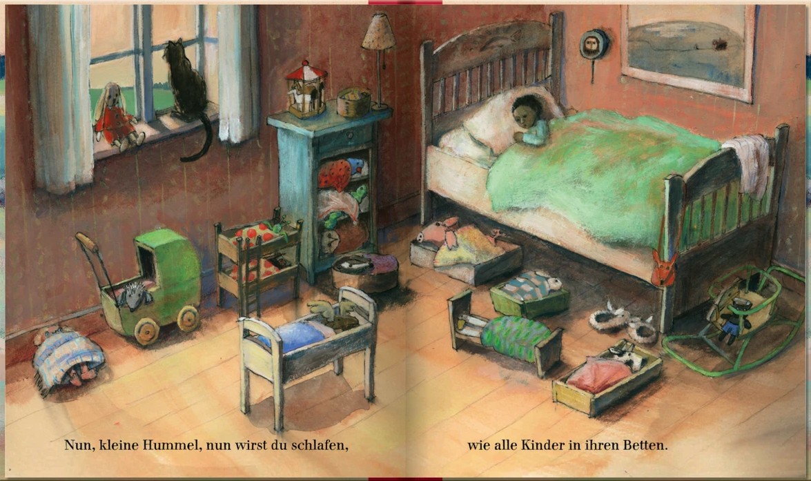 Das Lied „Alle gehen schlafen“* schrieb Astrid Lindgren für den Film „Wir Kinder aus Bullerbü“*, das Lisa, Anna und Britta singen, um sich Mut zu machen, als sie auf dem Heuboden übernachten. Und als die Künstlerin Marit Törnqvist hörte, wie das Lied auf der Beerdigung von Astrid Lindgren gesungen wurde, beschloss sie passend zu den Versen ein Bilderbuch zu gestalten.