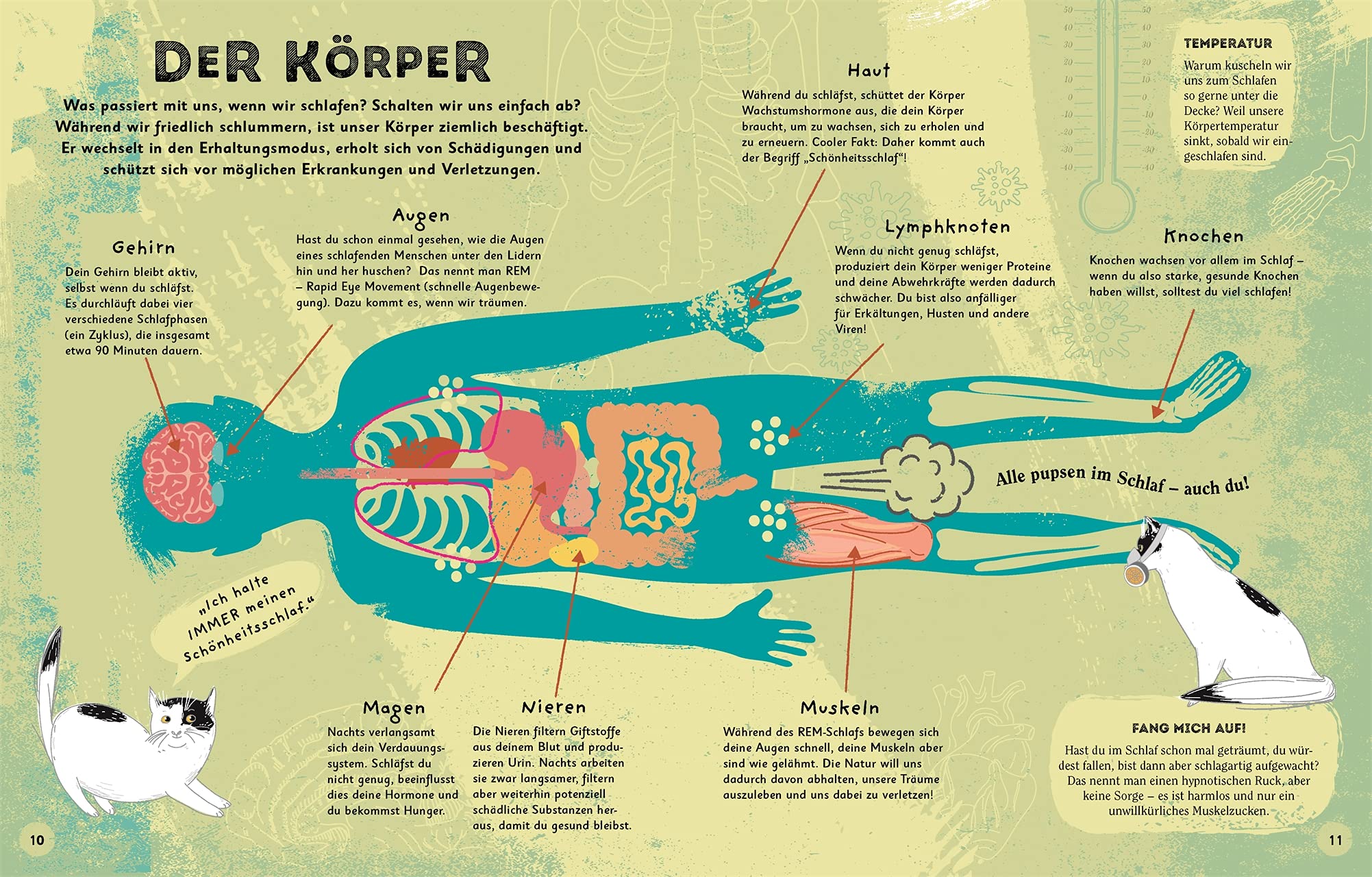 Was Seestern, Murmeltier, Lerche, Kolibri oder Eule mit dem Schlaf verbindet? Das verrät Vicky Woodgate in „Alles übers Schlafen: Warum wir träumen, wie Tiere schlafen und wie wir richtig müde werden“*. Auf rundum wundervoll-anschauliche und illustratorisch herrlich-charmante Weise – hierbei steht ihr Schlafexpertin Katze Mimi zur Seite – zeigt sie, was unter anderem mit unserem Körper im Schlaf passiert; welche Schlafphasen es gibt; erzählt von Mythen und Legenden; reist rund um die Welt; fliegt in den Sternenhimmel; taucht in die Geschichte des Schlafes ein sowie in das Tier- und Pflanzenreich. Mit verblüffenden Fakten, praktischen Tipps und spannenden Quizfragen – eine traumhafte Entdeckungsreise.