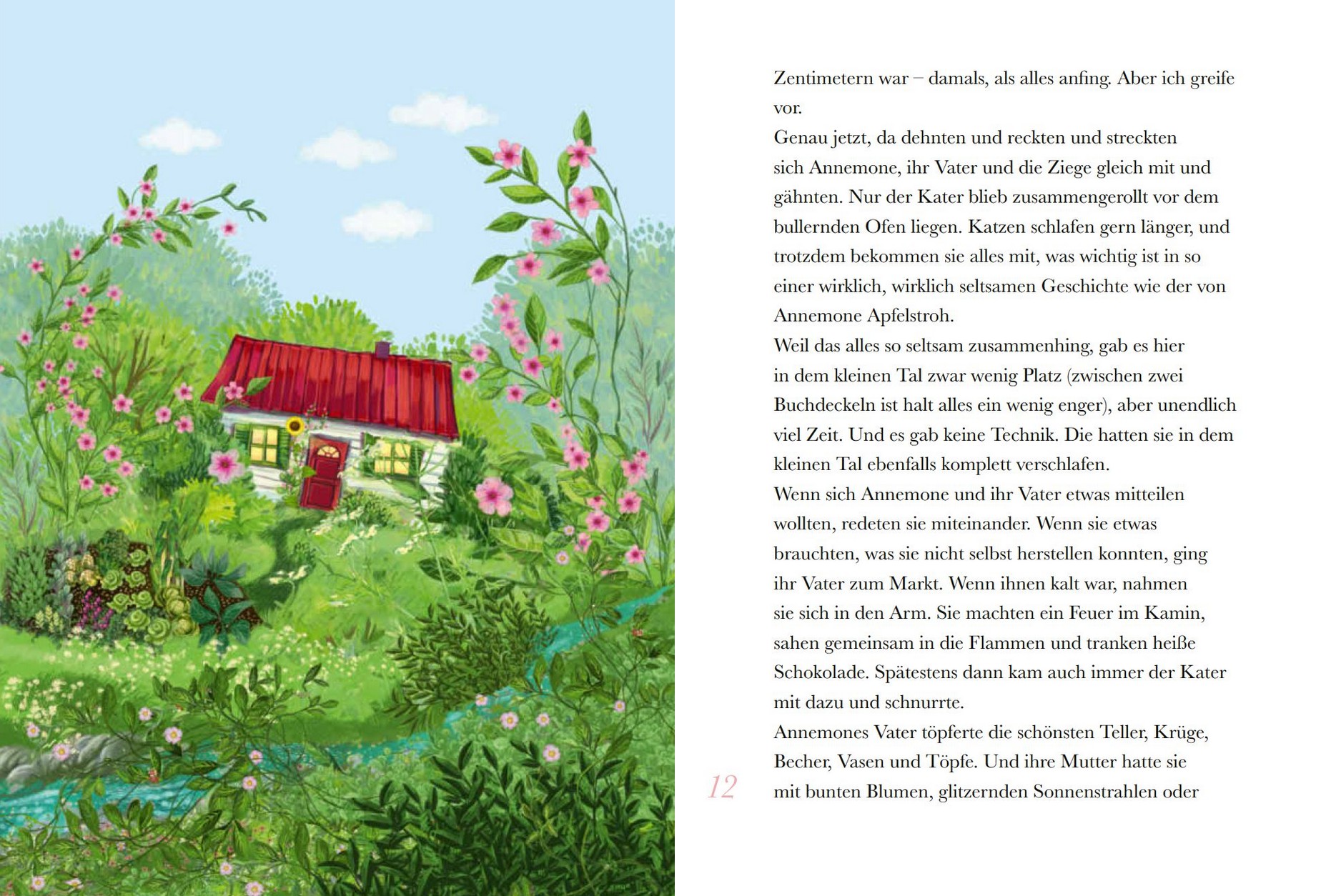 In ihrem kleinen Häuschen haben Annemone Apfelstroh und ihr Vater alles, was sie brauchen. Wenn ihnen kalt ist, nehmen sie sich in den Arm. Ist ihnen langweilig, erzählen sie sich Geschichten oder spielen miteinander. Kichern sie im Winter miteinander, fallen dicke Schneeflocken herunter. In ihrem kleinen Tal haben sie zwar wenig Platz, aber unendlich viel Zeit. Und sie haben sich. Aber eben jene Zeiten liegen schon lange zurück. So lange seit Annemones Mutter plötzlich und auf unerklärliche Weise verschwunden ist.
