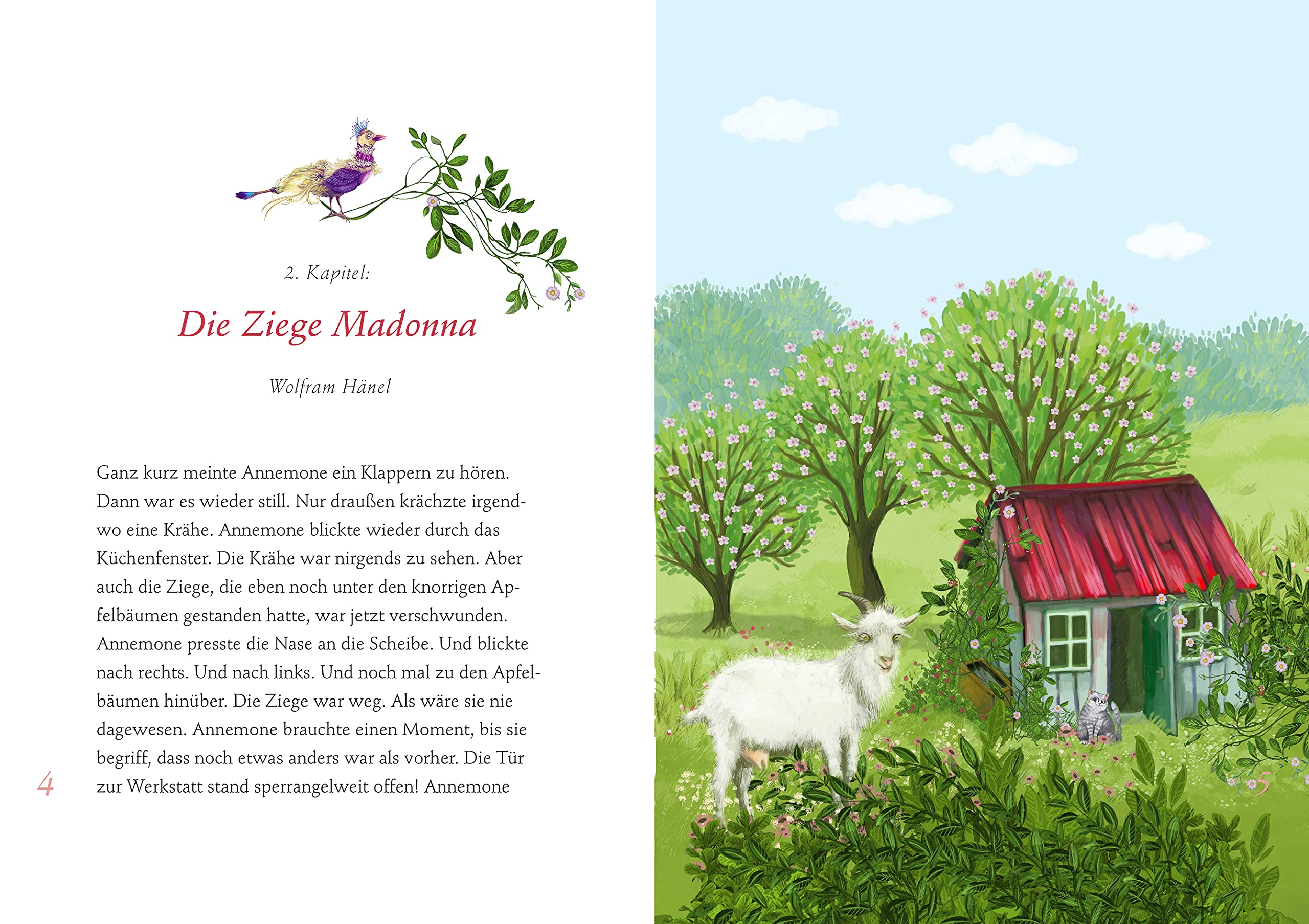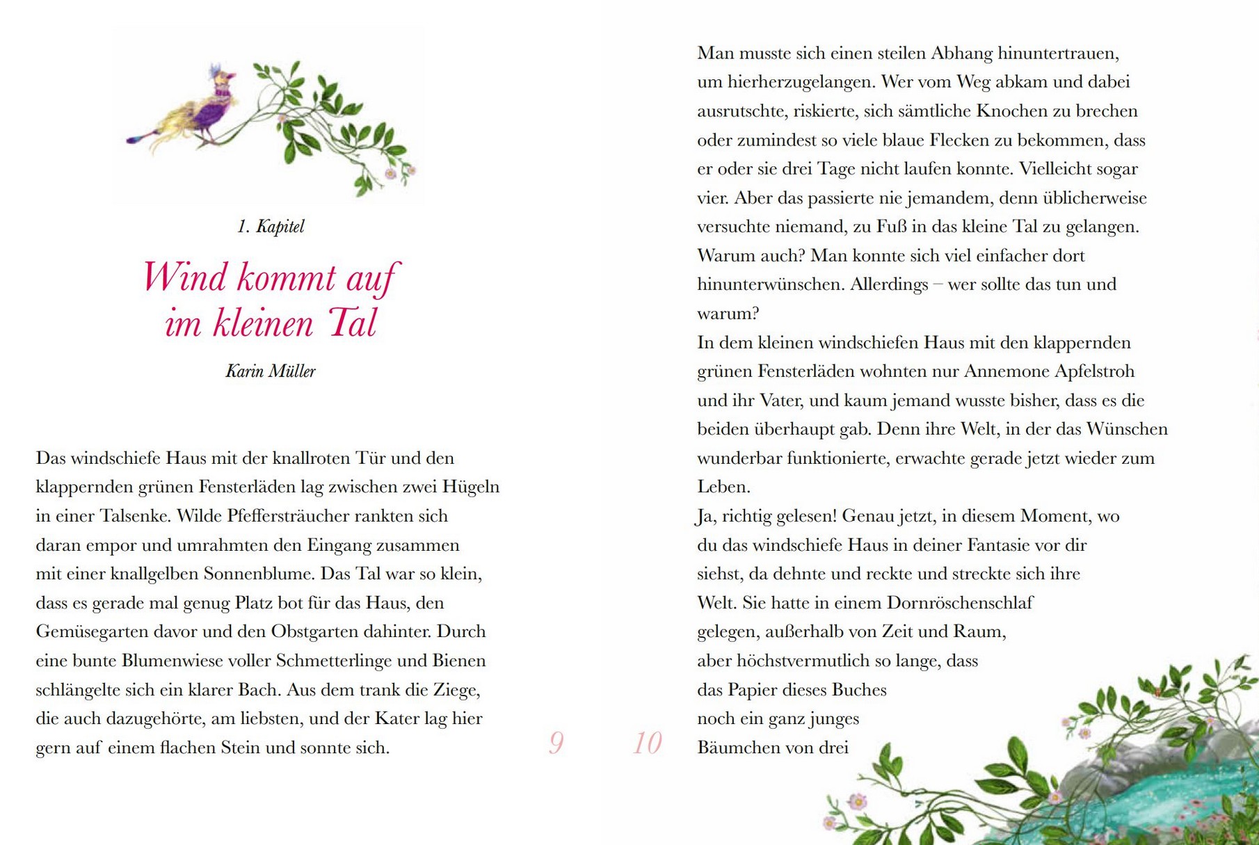 Zwischen zwei Hügeln in einer Talsenke steht ein windschiefes Haus mit einer knallroten Tür und klappernden grünen Fensterläden. Um dort hinzugelangen, muss man sich hinunterwünschen. In diesem kleinen Häuschen wohnen „Annemone Apfelstroh“, ihr Vater, die einhornige Ziege Madonna und der dicke Kater Herr Kuhn. Alles könnte so schön sein, wenn nicht die Mutter vor vielen Jahren plötzlich verschwunden wäre. Aber als Annemone eines Tages unerlaubt die Töpferscheibe ihres Vaters in Gang setzt, ist nichts mehr, wie es vorher war…