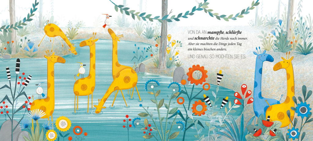 Mümmel, mampf – Berti und die Giraffen machten jeden Tag das Gleiche immer zur gleichen Zeit. Sie knabberten Blätter von den Baumkronen. Danach stillten sie ihren Durst am Wasserloch, und wenn sie müde wurden, rollten sie ihre langen Hälse ein und machten ein Nickerchen. Jeder Tag war wie der andere. Mümmel, mampf. Schluck, schlürf. Schnarch, schnarch, schnarch. Genau so mochten sie es.