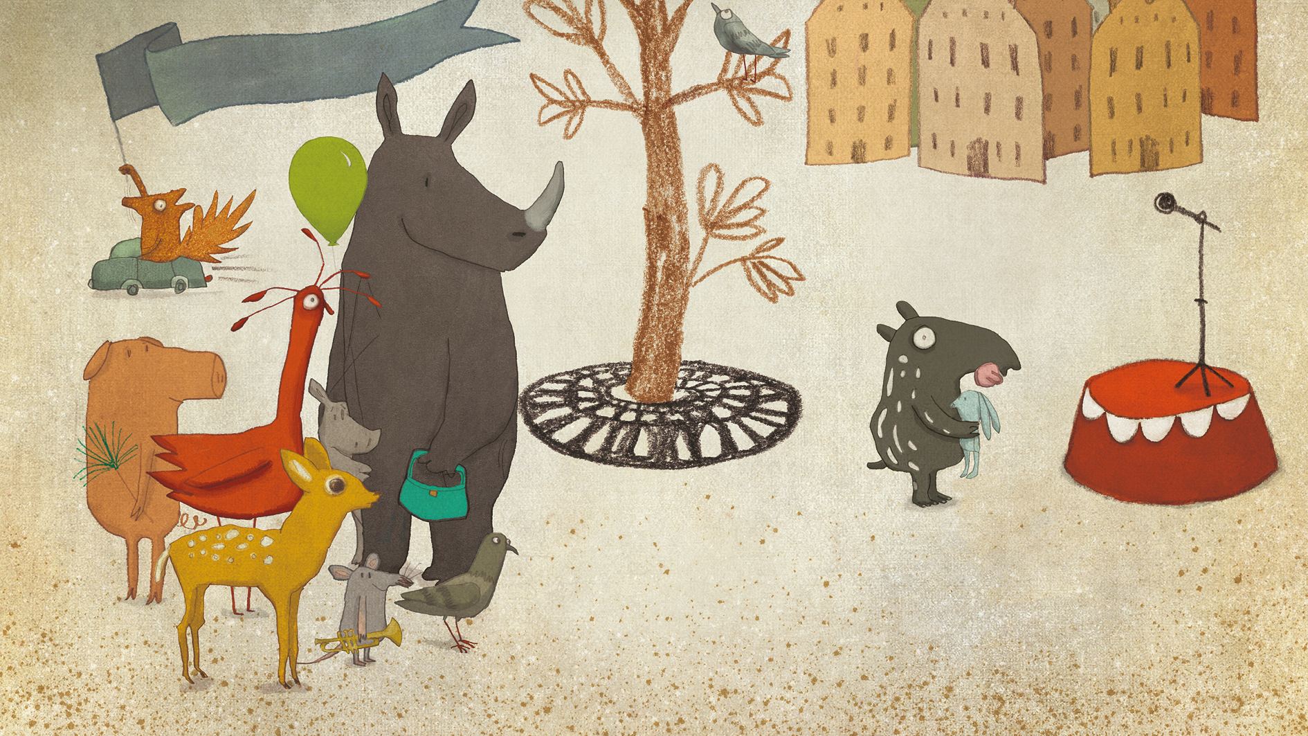 Die nächsten Kandidaten stehen schon bereit. Die schimpigsten Schimpfwörter sausen durch die Luft, eines origineller als das andere. Dann erscheint der Vorjahressieger: Harald Hirsch. Elegant schreitet er zur Bühne. Aber, oh, er bleibt mit seinem Geweih in einer Girlande hängen und stolpert über Theo Tapir. Autsch. Und es röhrt ein „Doofkopf“ über den Dorfplatz. Also wirklich! Ganz und gar nicht lustig. Nicht mal ein klitzekleines bisschen. Buh. Das Publikum ist außer sich…