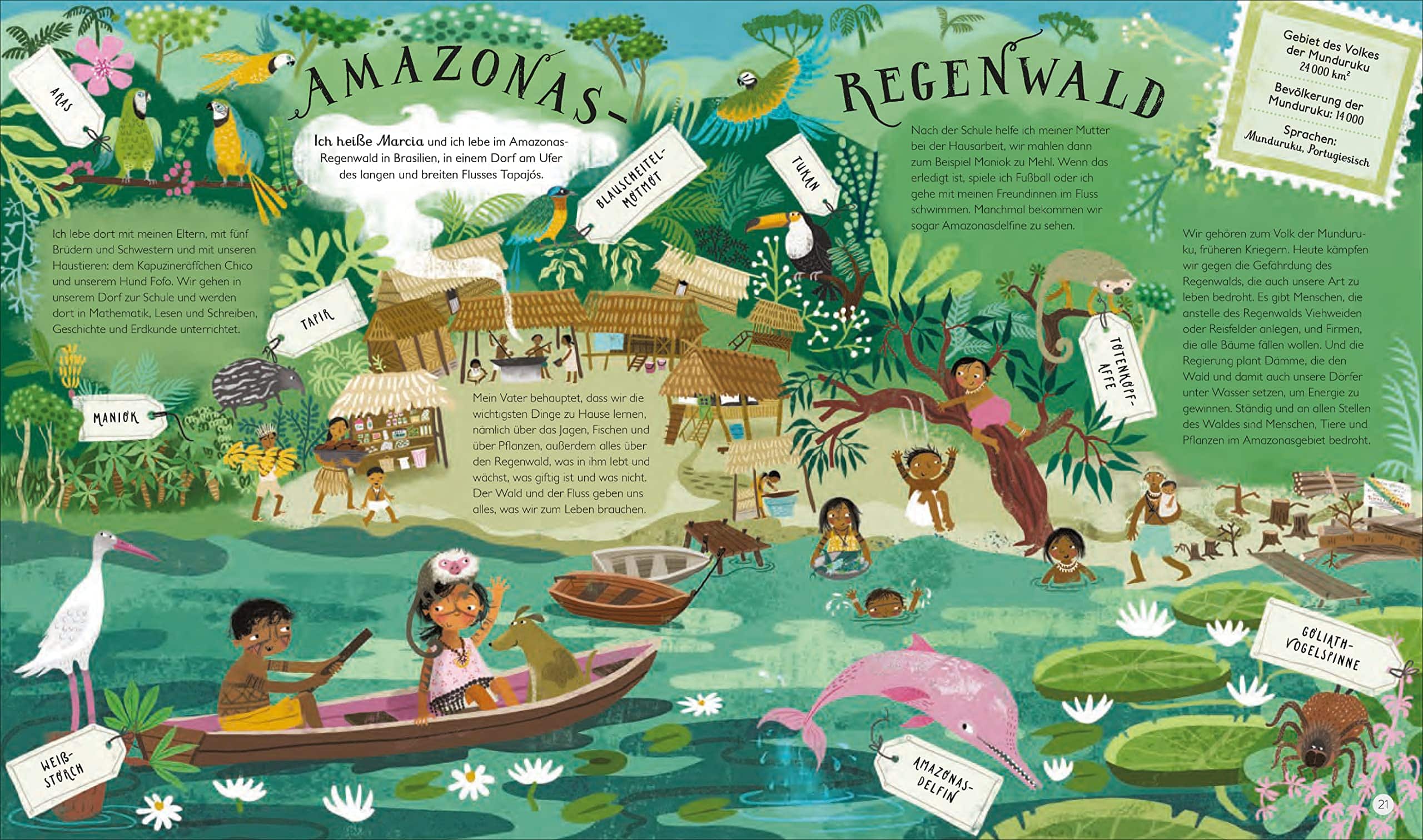 In „Das ist unsere Welt: Von Alaska bis zum Amazonas – 20 Kinder zeigen, wie sie leben“* entführt Tracey Turner zu zwanzig verschiedenen Orten rund um den Globus und zeigt dabei nicht nur den Lebensraum und die Tierwelt dort, sondern stellt das Leben von Kindern sowie ihren Familien, ihre Bräuche und Kultur vor. Wundervoll in traumhaft-kunstvolle Bilder von Åsa Gilland übertragen. Seite für Seite ein Blickfang. Voller Dynamik, voller Details. Einen erster Einblick in die Vielfalt der Welt, der viele Anregungen zum Entdecken und zu weiterführenden Gesprächen bietet.