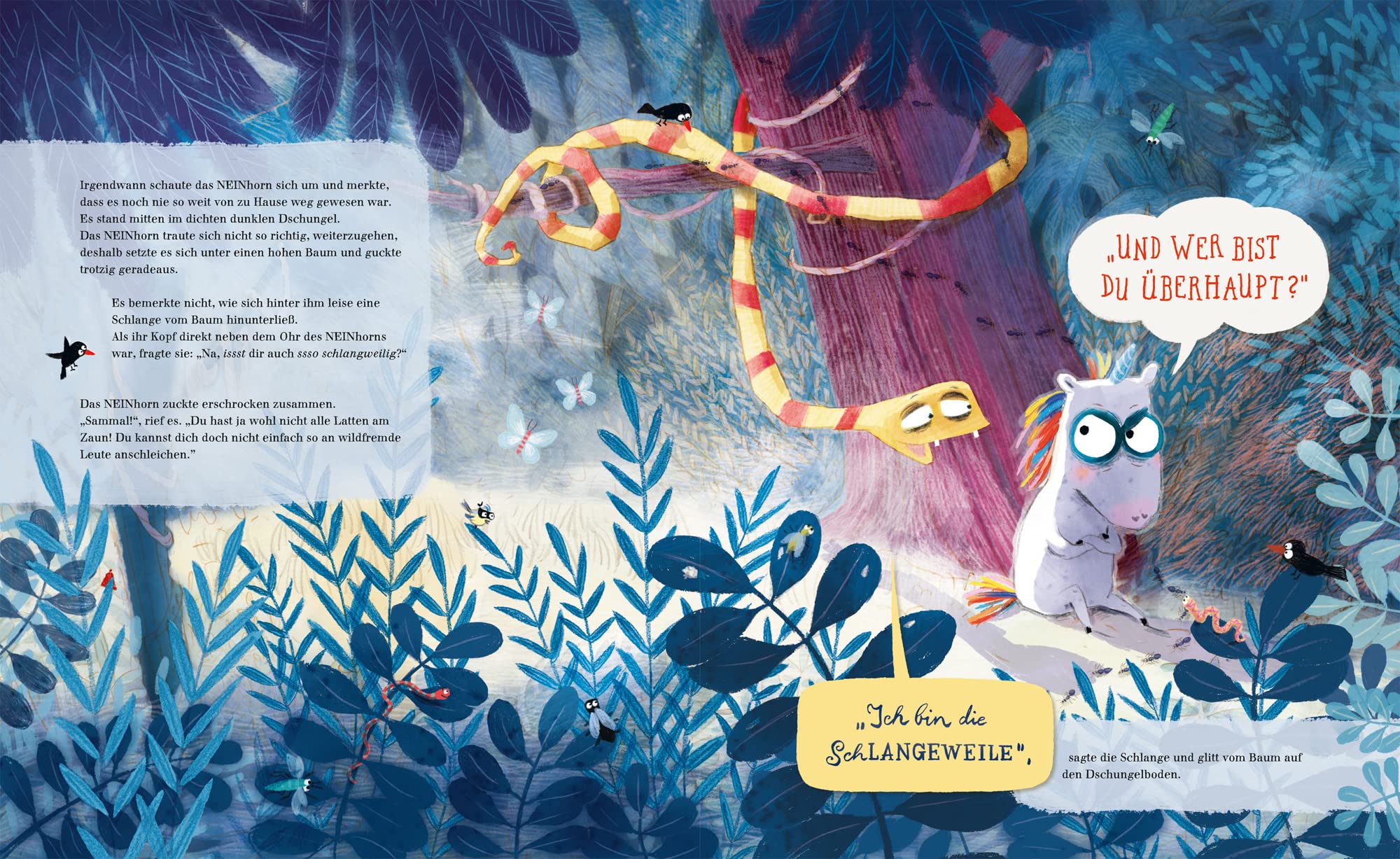 Auch das NEINhorn ist ganz schön sauer und trabt aus dem Herzwald hinaus. Irgendwann schaut es sich um und merkt, dass es noch nie so weit weg von zu Hause gewesen ist. Es steht mitten im dichten Dschungel. Unter einem Baum sitzend bemerkt das NEINhorn nicht, wie sich hinter ihm leise eine Schlange vom Baum hinunter ssschlängelt. Es ist die SchLANGEWEILE und ihr issst ssso schlangweilig! Sie könnten ja zzzusssammen ssspielen. Aber egal, was das NEINhorn vorschlägt, sie hat keine Schlussst darauf. Das NEINhorn hat eine Idee und dazu braucht es die Hilfe von der KönigsDOCHter, dem WASbären und dem NAhUND…