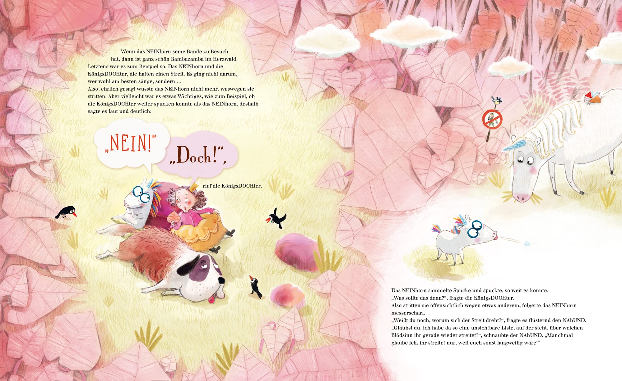 Wenn das NEINhorn die KönigsDOCHter, den NAhUND und den WASbären zu Besuch hat, dann ist ganz schön Rambazamba im Herzwald. Vor allem eines Tages als der WASbär auf dem Hummelrummel gewesen ist und für das NEINhorn sowie die KönigsDOCHter Riesenlutscher mitbringt. Im Streit darum schubst die KönigsDOCHter das NEINhorn. Und das NEINhorn schubst zurück. Und – zack! – liegen sie mal wieder auf dem Boden und raufen miteinander. Der WASbär ist ganz unglücklich, er hatte den beiden eine Freude machen wollen und jetzt das.