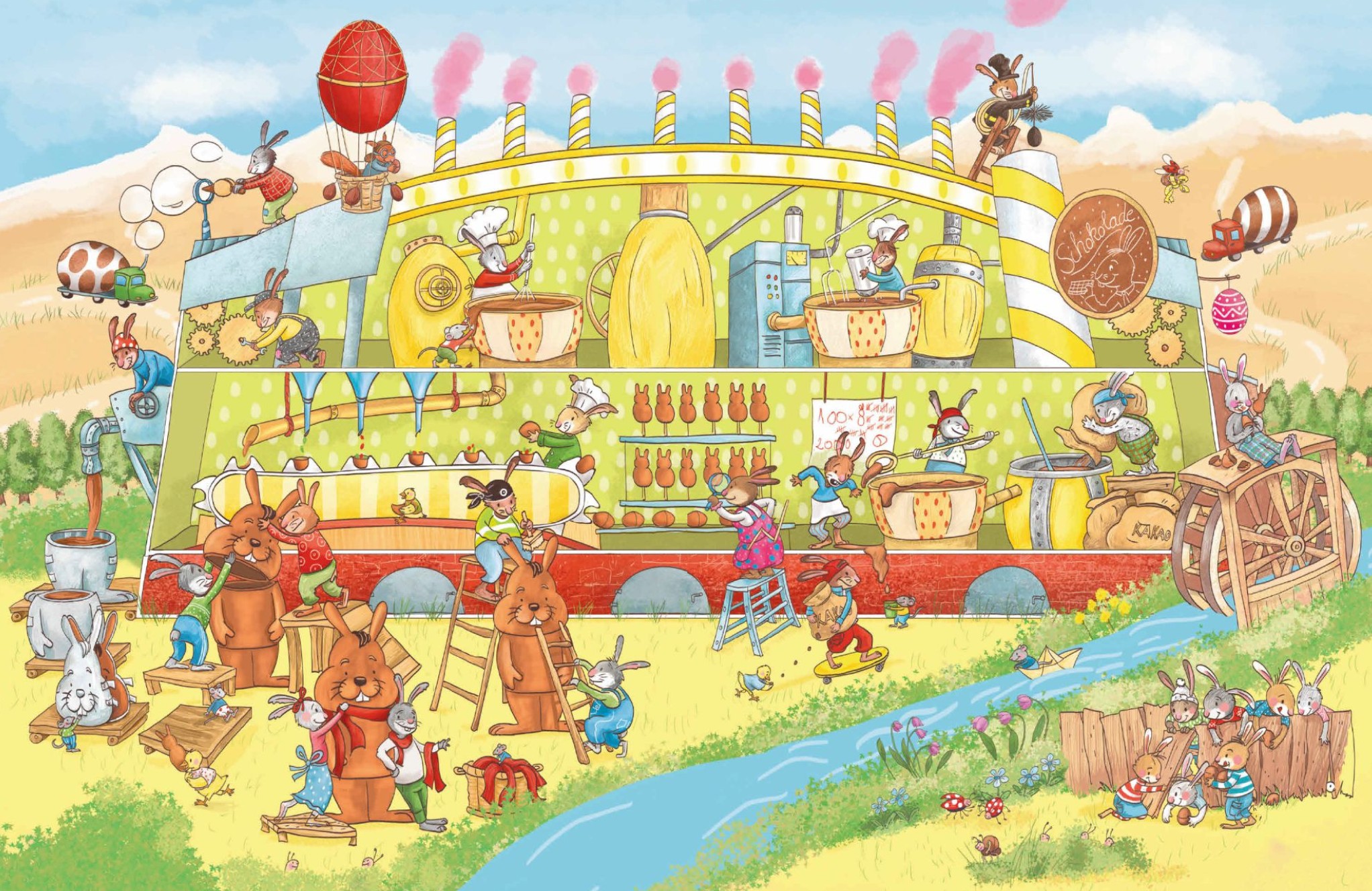 In der großen Schokoladenfabrik wird der Kakao in großen Schüsseln angerührt. Los geht die Produktion von Schokoladenhasen und Schokoladenostereiern. Die sind einfach lecker. Das denken sich auch die Häschen-Zwillinge Mila und Milo und ihre Freunde. Schwupps, schlüpfen sie durch ein Loch im Zaun. Vielleicht bleibt ja ein wenig Schokolade für sie übrig?